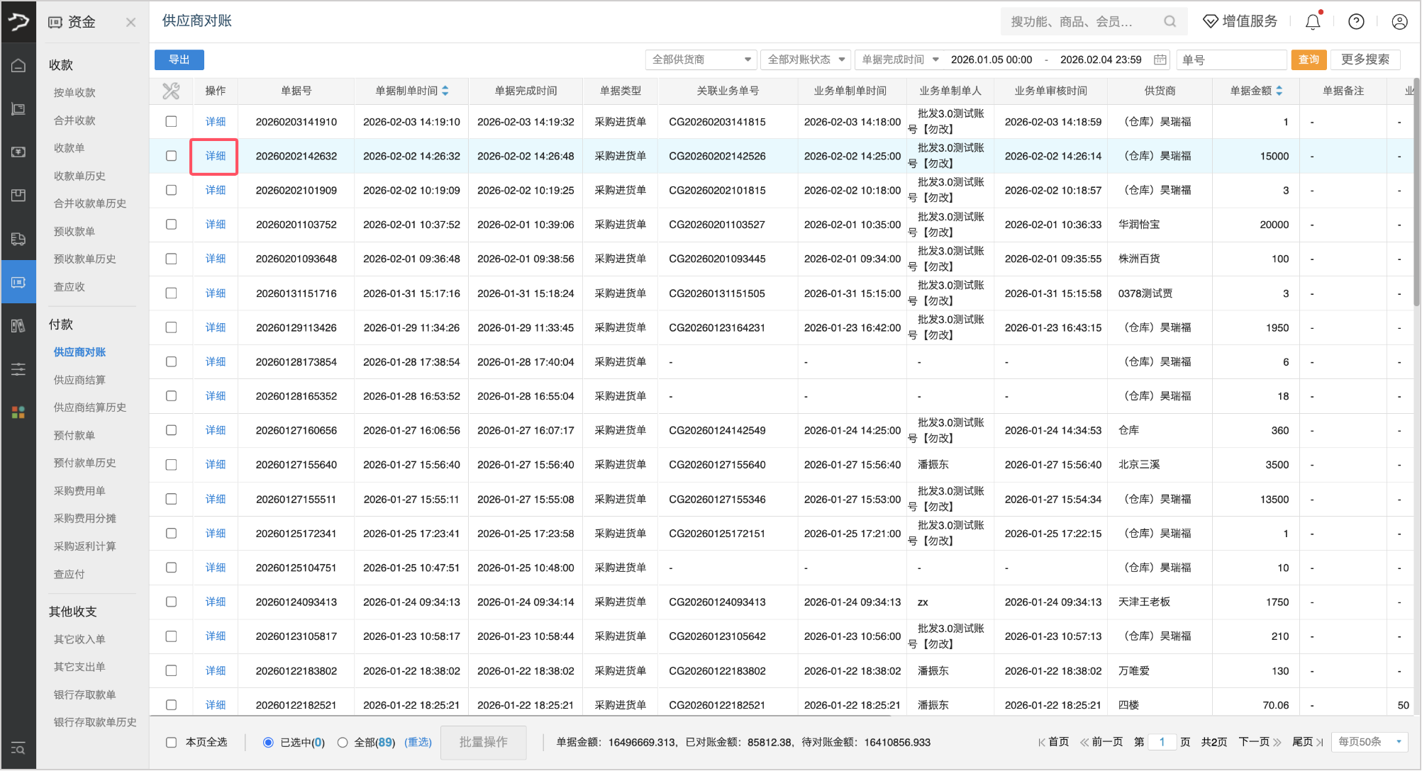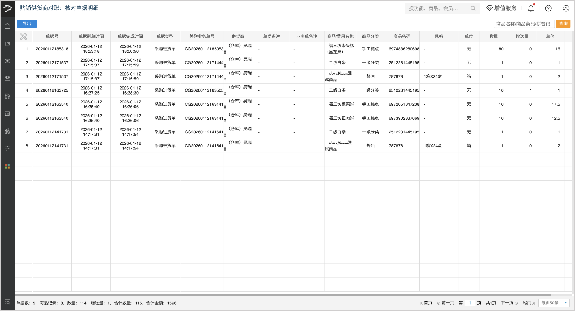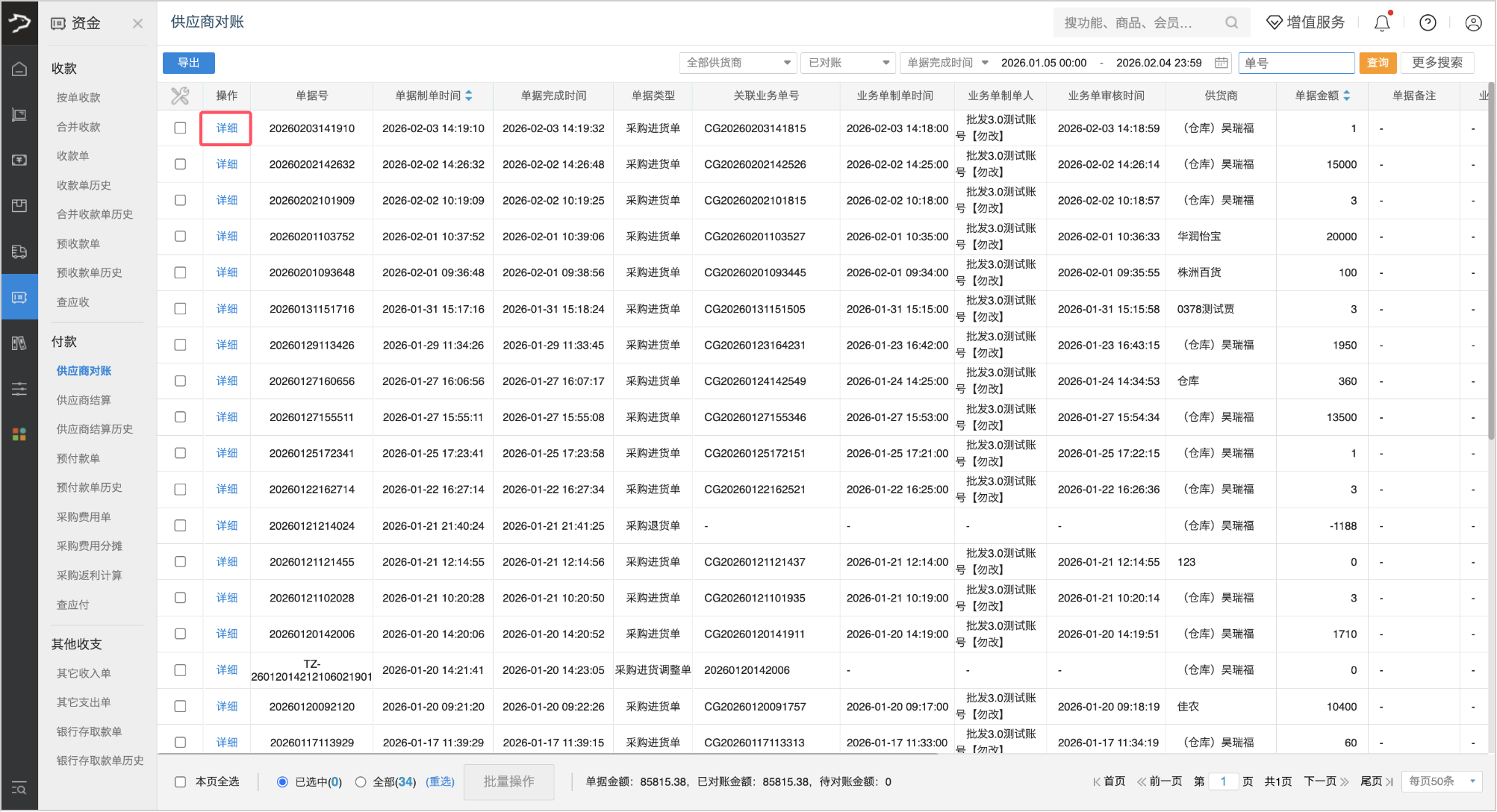 1、在供应商对账列表中,找到待对账的目标单据,点击该单据行的【详细】按钮。