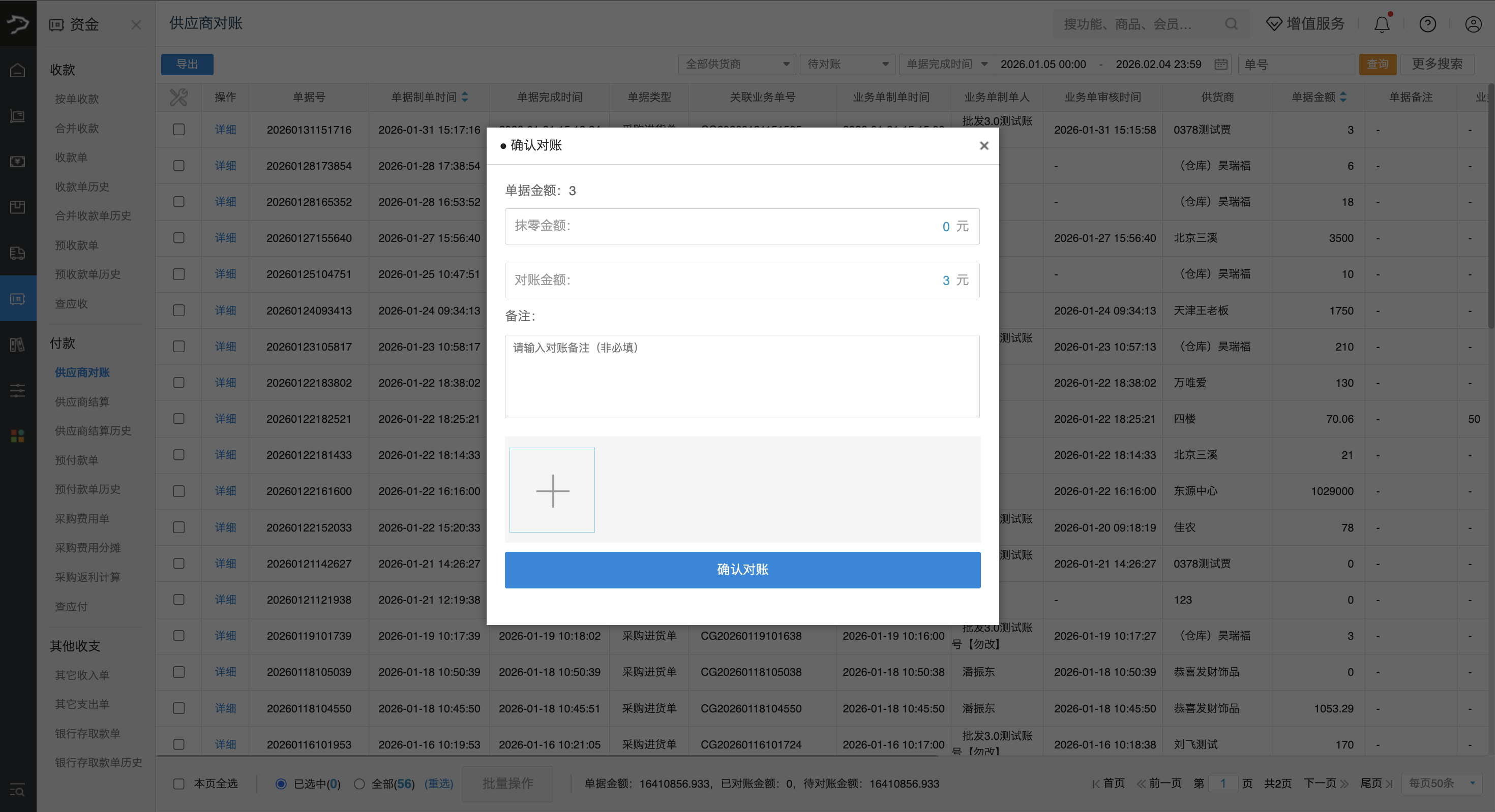 2、在【确认对账】弹窗中,确认或调整抹零金额、对账金额,可补充备注或上传附件,完成后点击【确认对账】按钮。