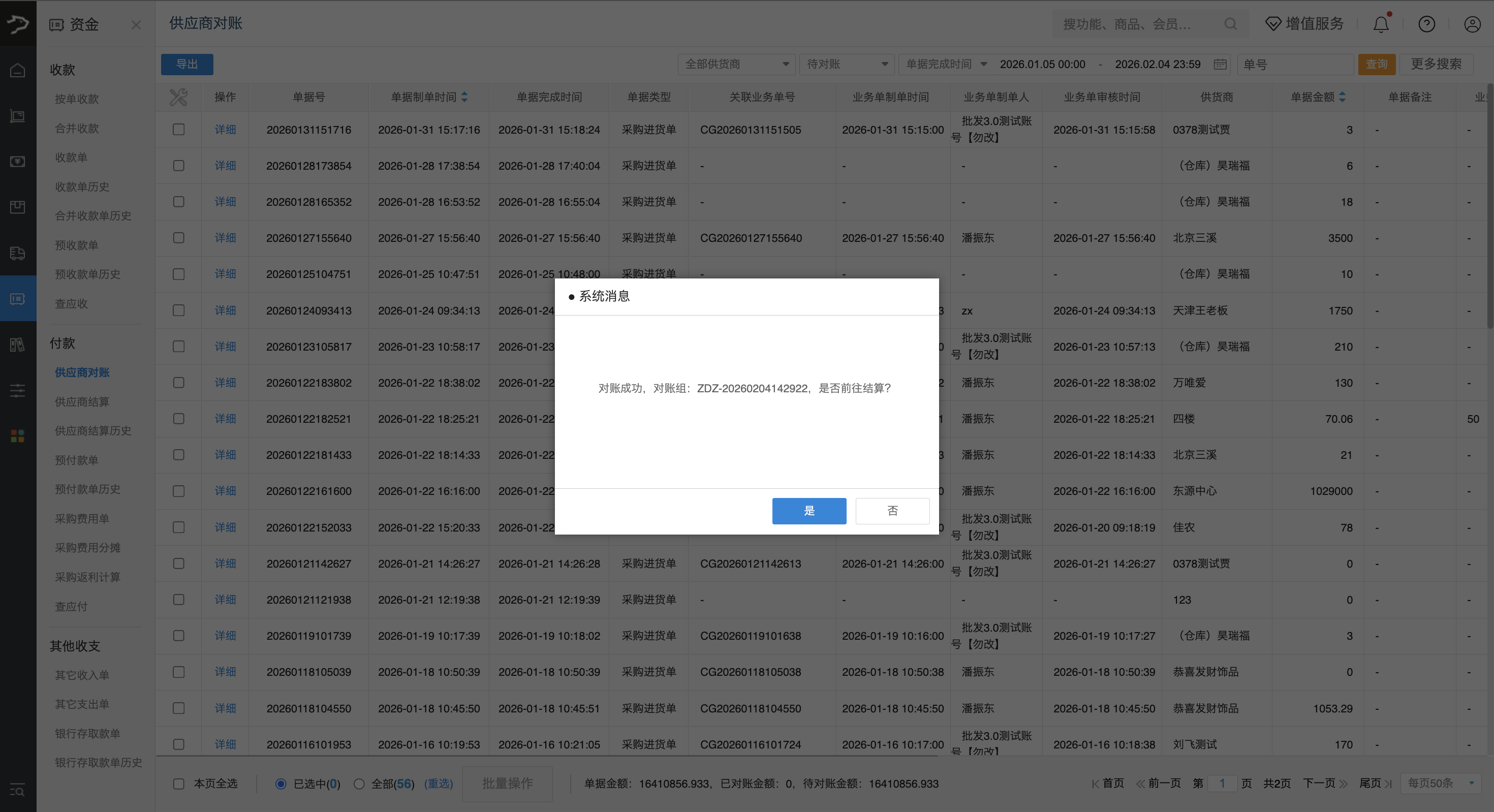 3、系统提示 “对账成功”,可选择直接跳转结算或返回对账列表,所有选中单据状态同步更新为 “已对账”。