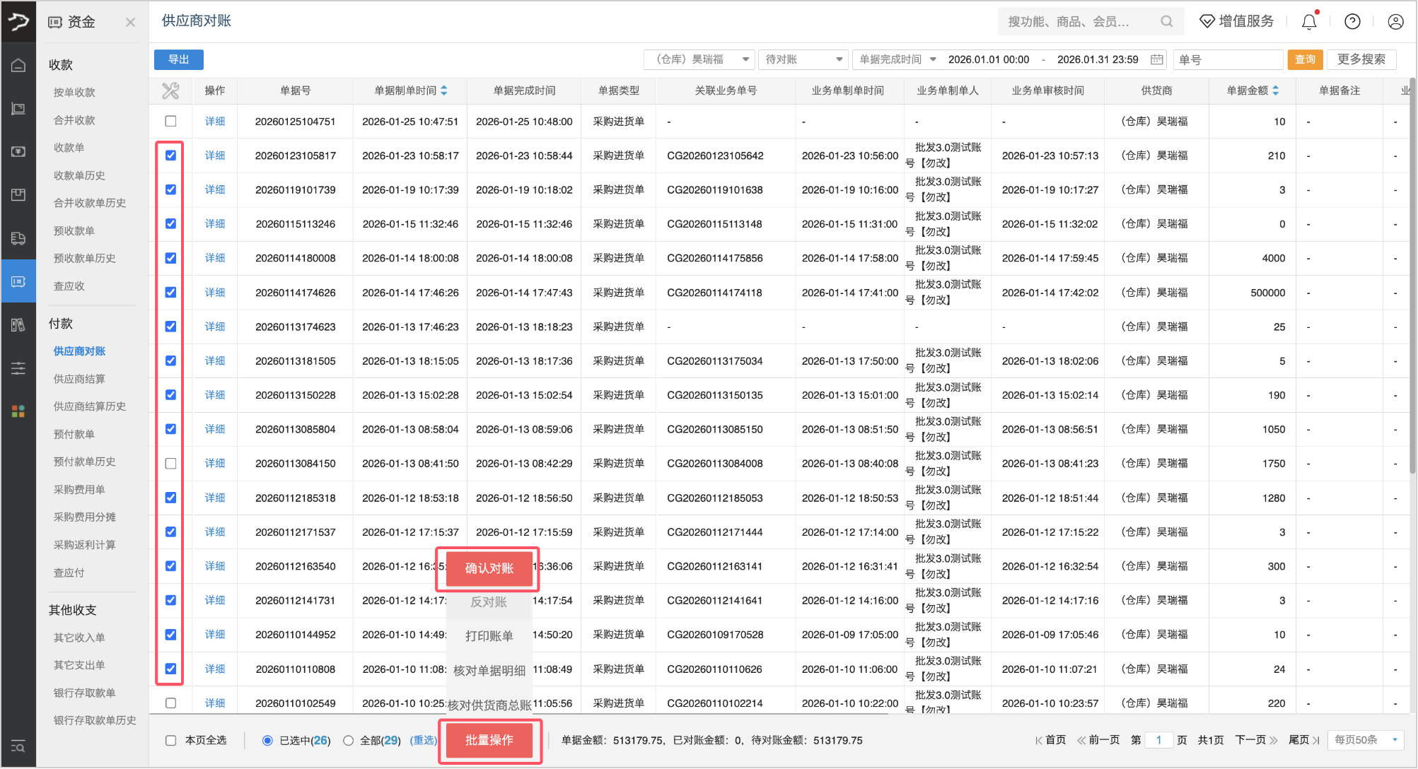 1、在供应商对账列表中,勾选需要对账的待对账目标单据,点击底部【批量操作】按钮,选择【确认对账】。