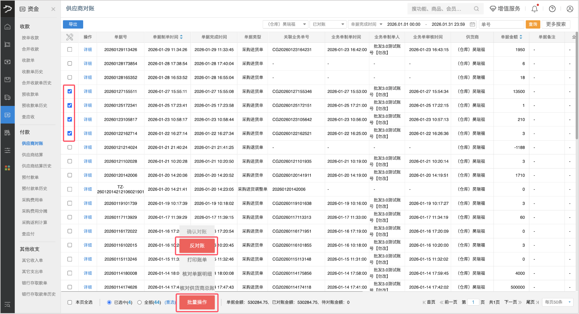 1、在供应商对账列表中,勾选需要回退的已对账目标单据,点击底部【批量操作】按钮,选择【反对账】。