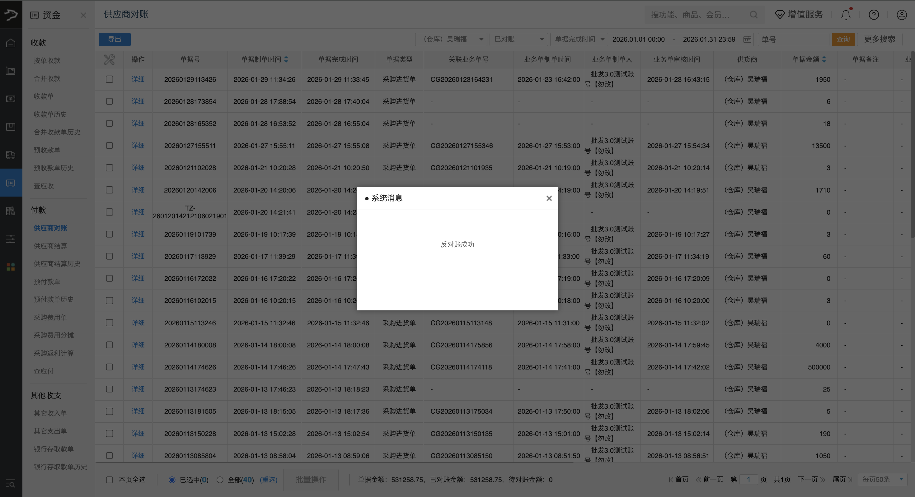 3、系统提示反对账成功,返回对账列表后,所有选中单据状态同步更新为 “待对账”。