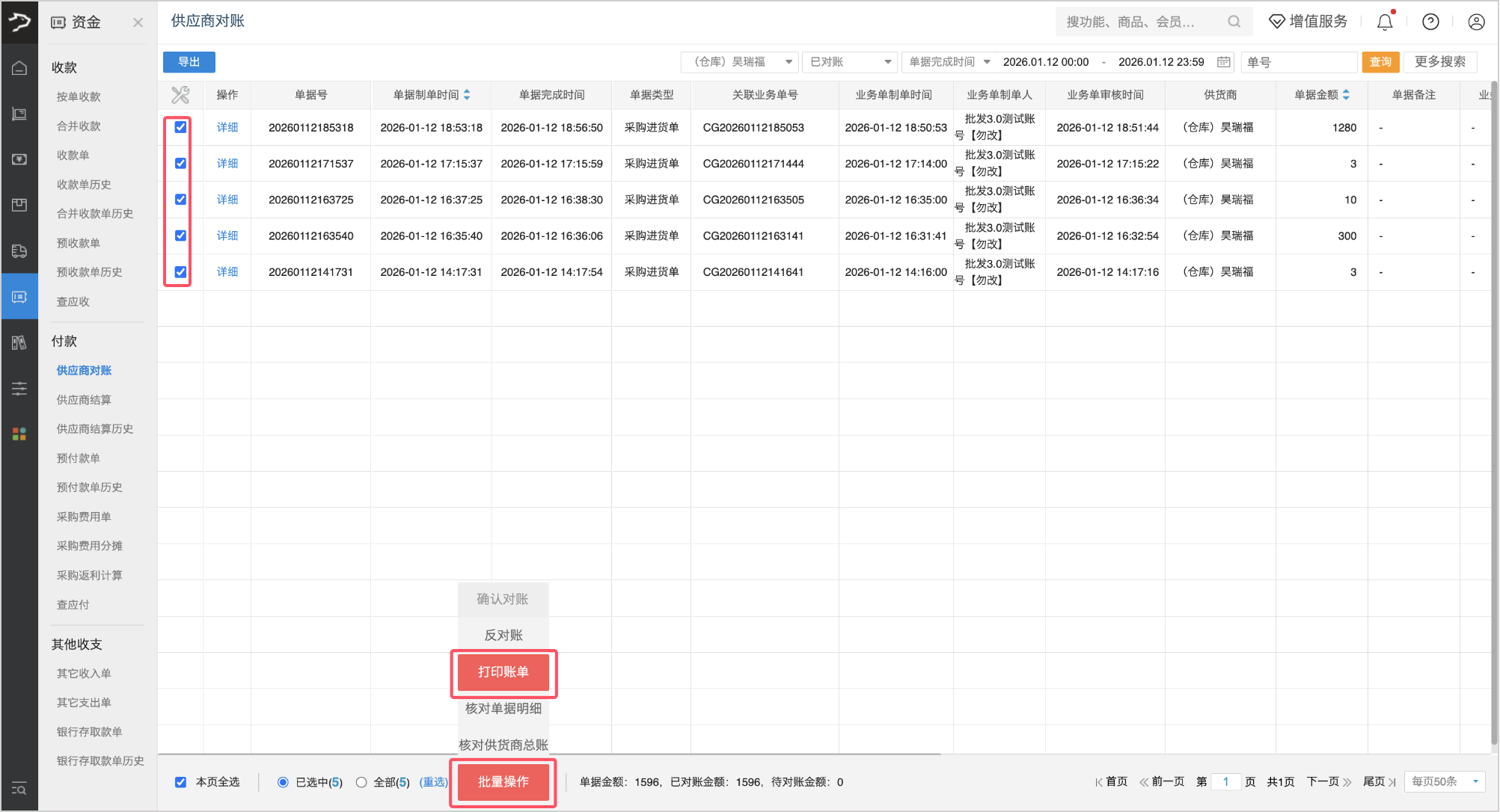 1、在供应商对账列表中,勾选需要打印的目标单据,点击底部【批量操作】按钮,选择【打印账单】。