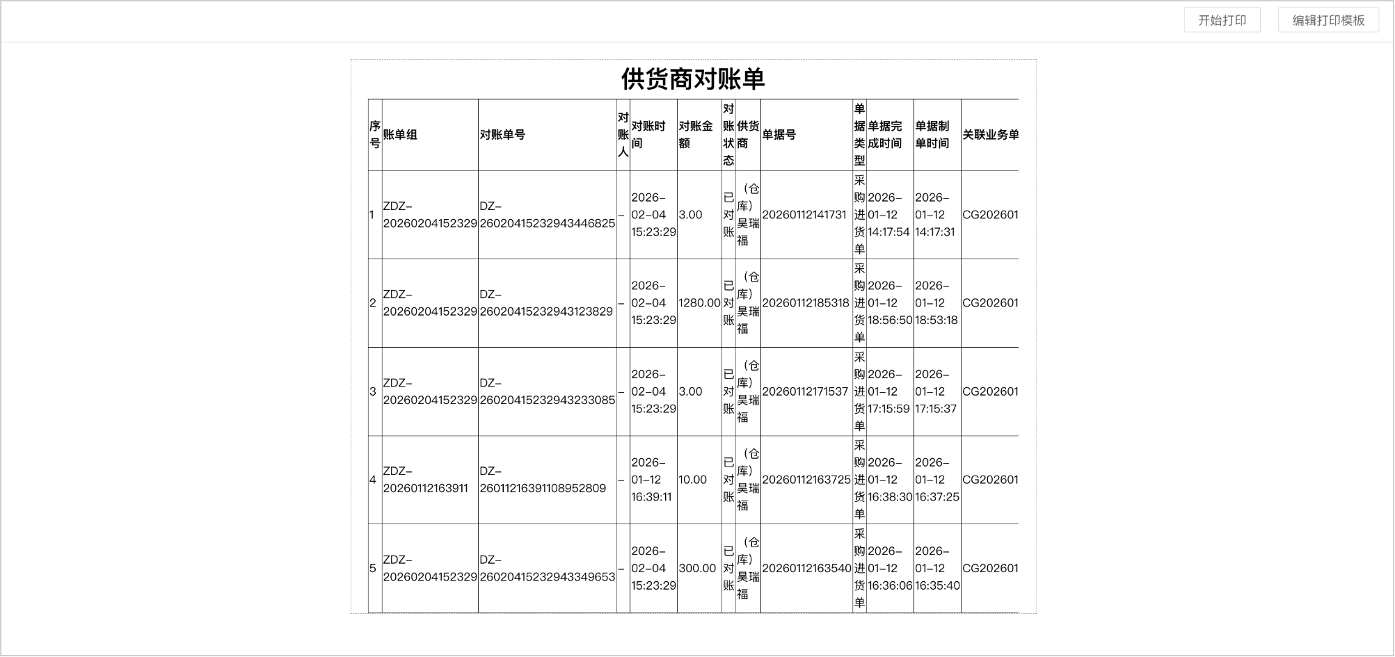 2、系统生成并展示包含所有选中单据的《供应商对账单》,可直接开始打印或编辑打印模板后再打印。