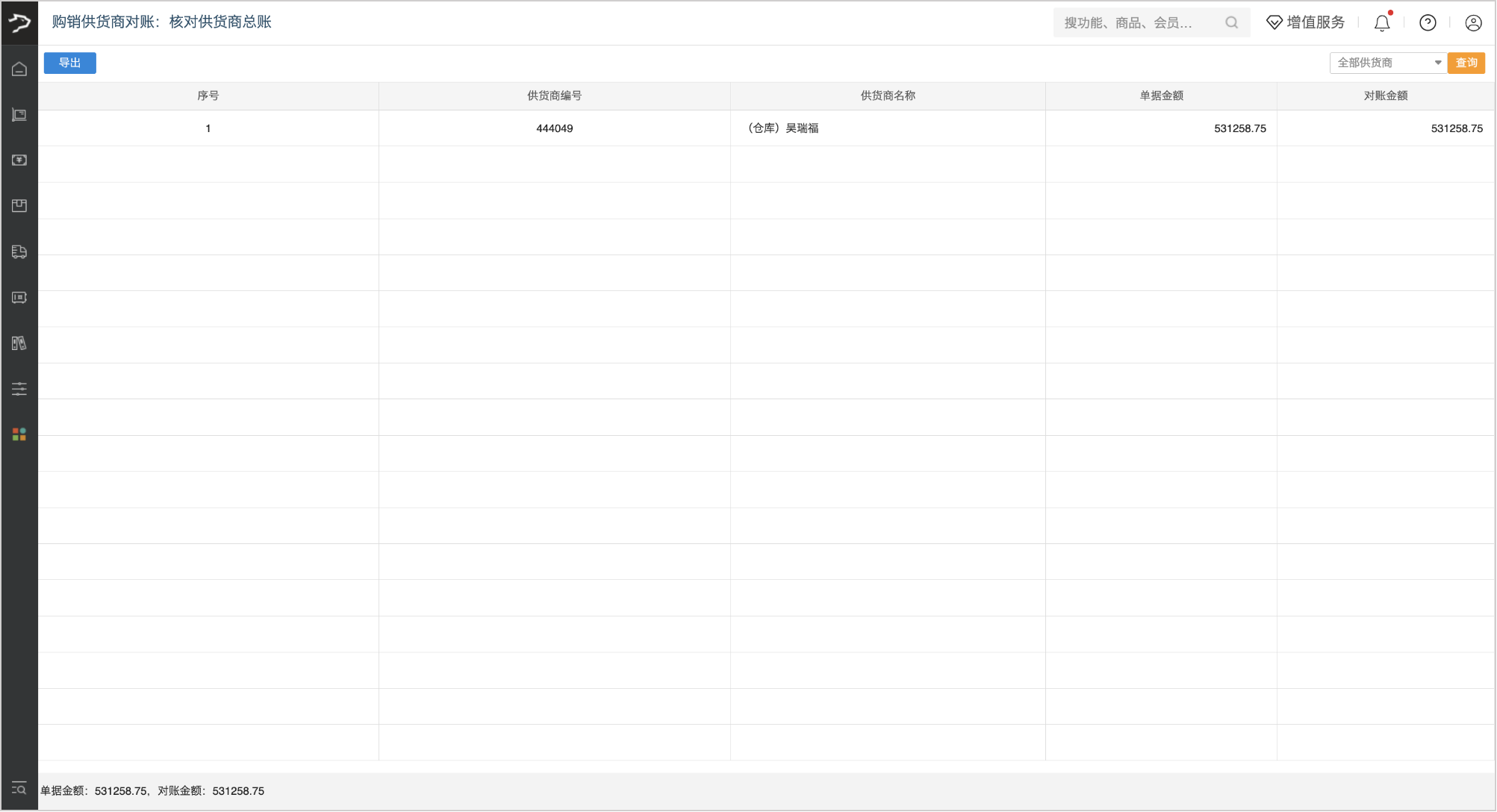 2、系统展示所有选中单据对应供货商的累计单据金额、已对账金额、待对账金额等总账信息,便于与供应商核对往来账款。