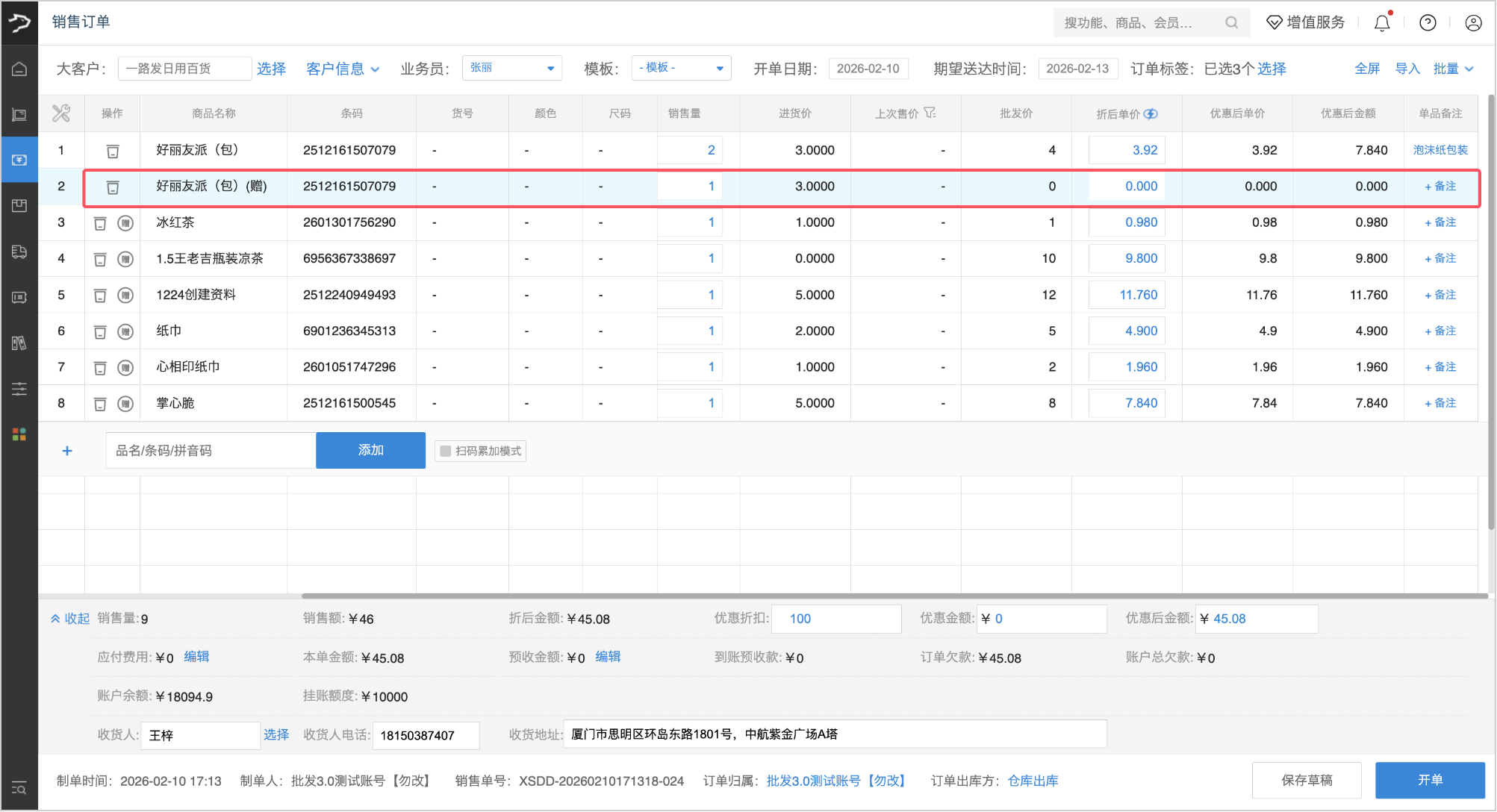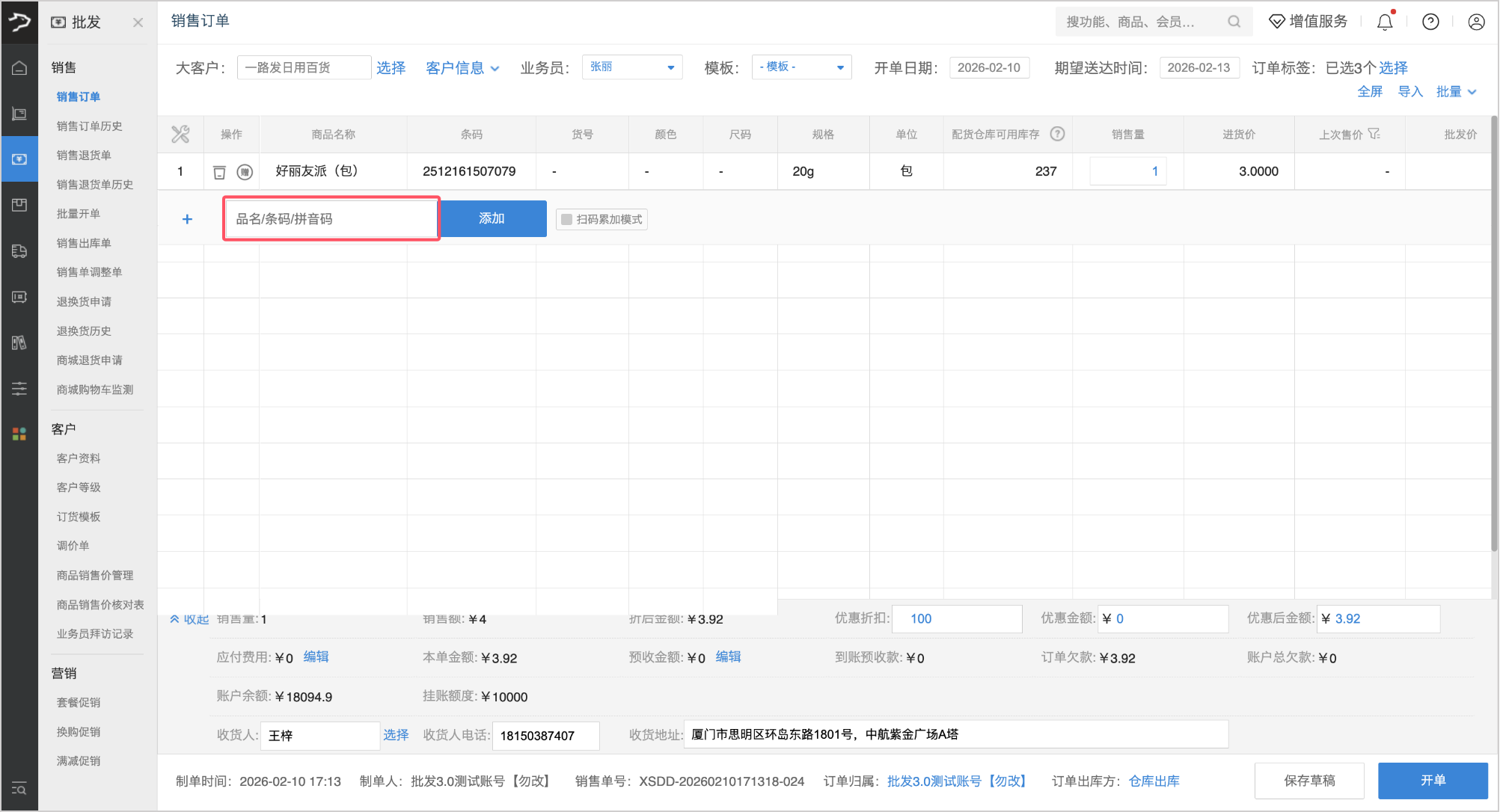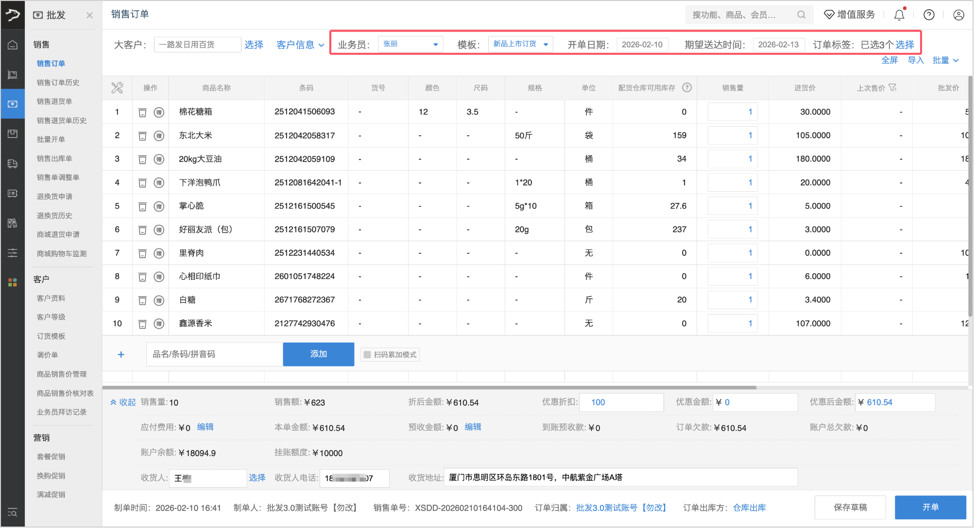 选择客户后,系统自动加载客户的收货人、收货电话、收货地址等信息并显示在订单页面。
