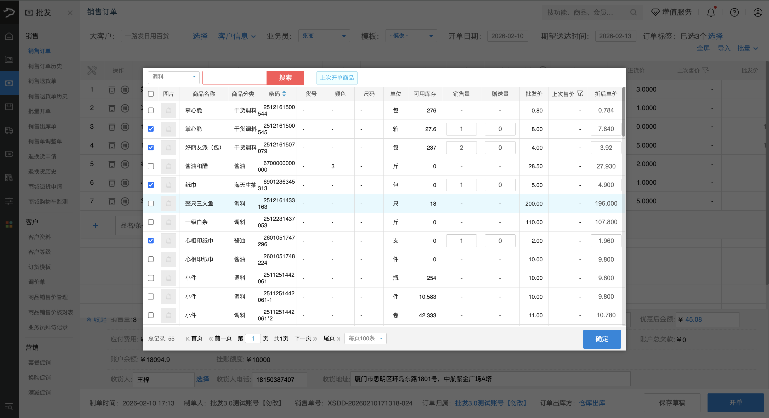 • 选择添加:点击【添加】,搜索商品或选择【上次开单商品】,勾选后设置销量、赠送量、折后单价,确认即可添加。