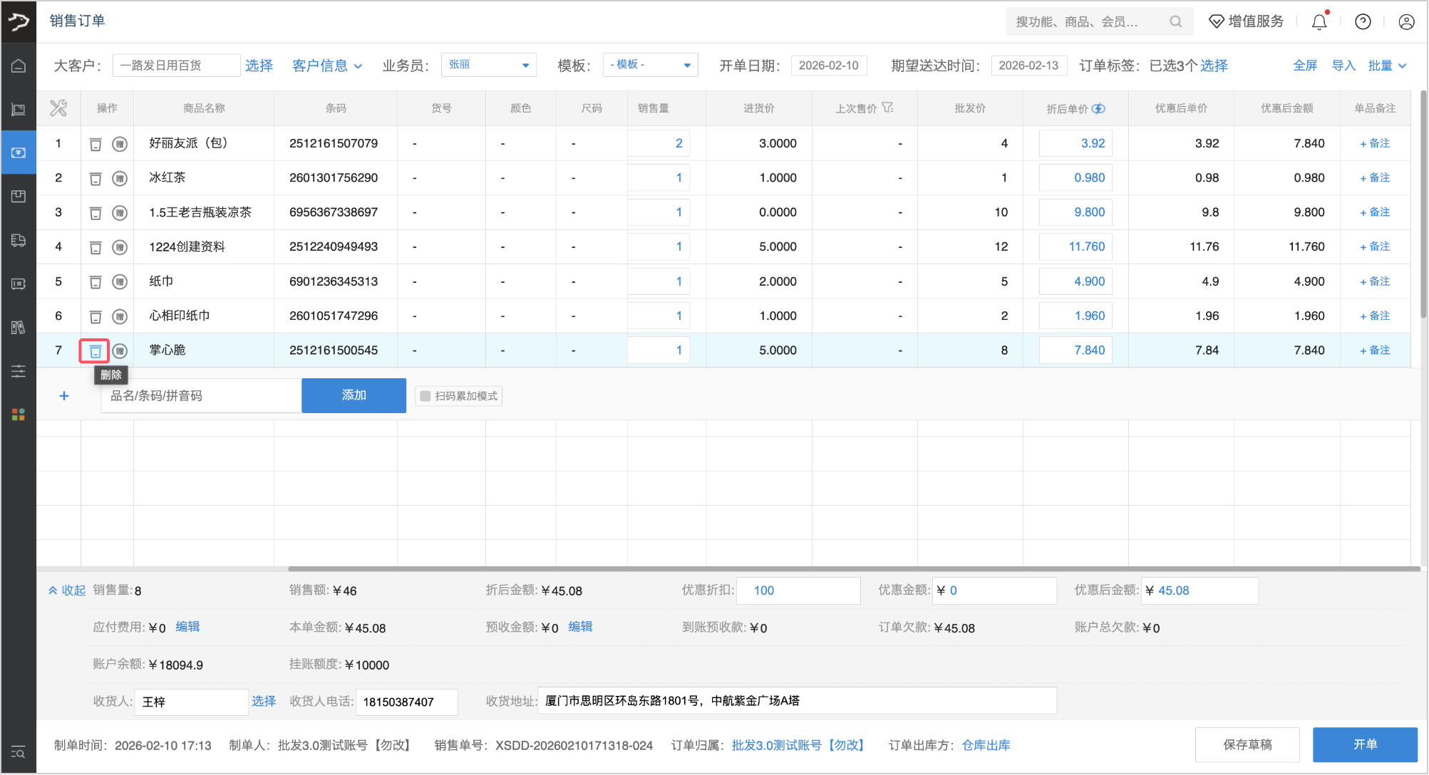 删除商品:点击 “垃圾桶” 图标,可删除当前行的商品。