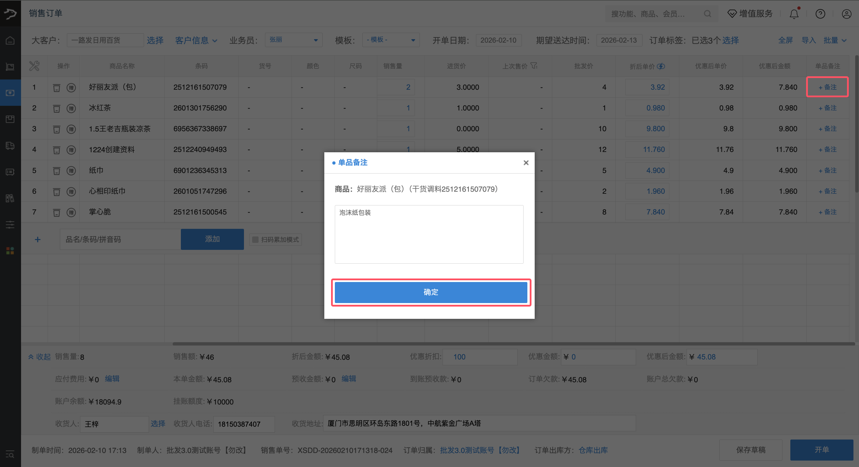 单品备注:点击 【+ 备注】,可添加该商品的特殊说明(如包装要求、发货备注等)。