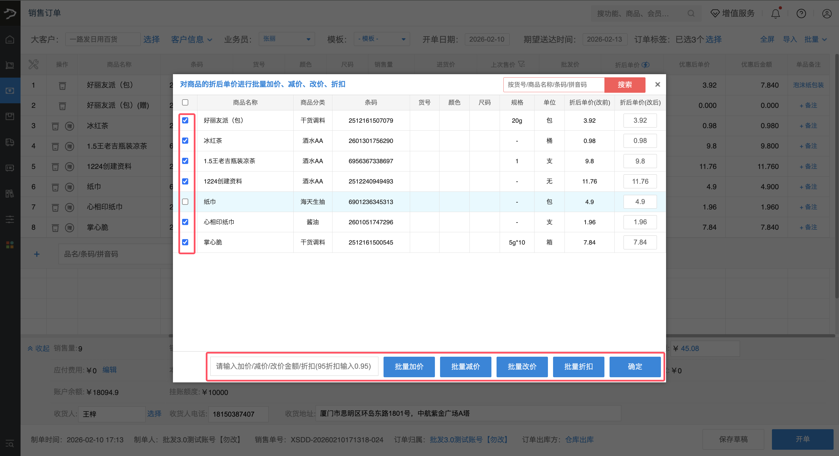批量改价:支持对选中商品的折后单价进行批量加价、减价、改价、折扣率填写,快速调整价格。