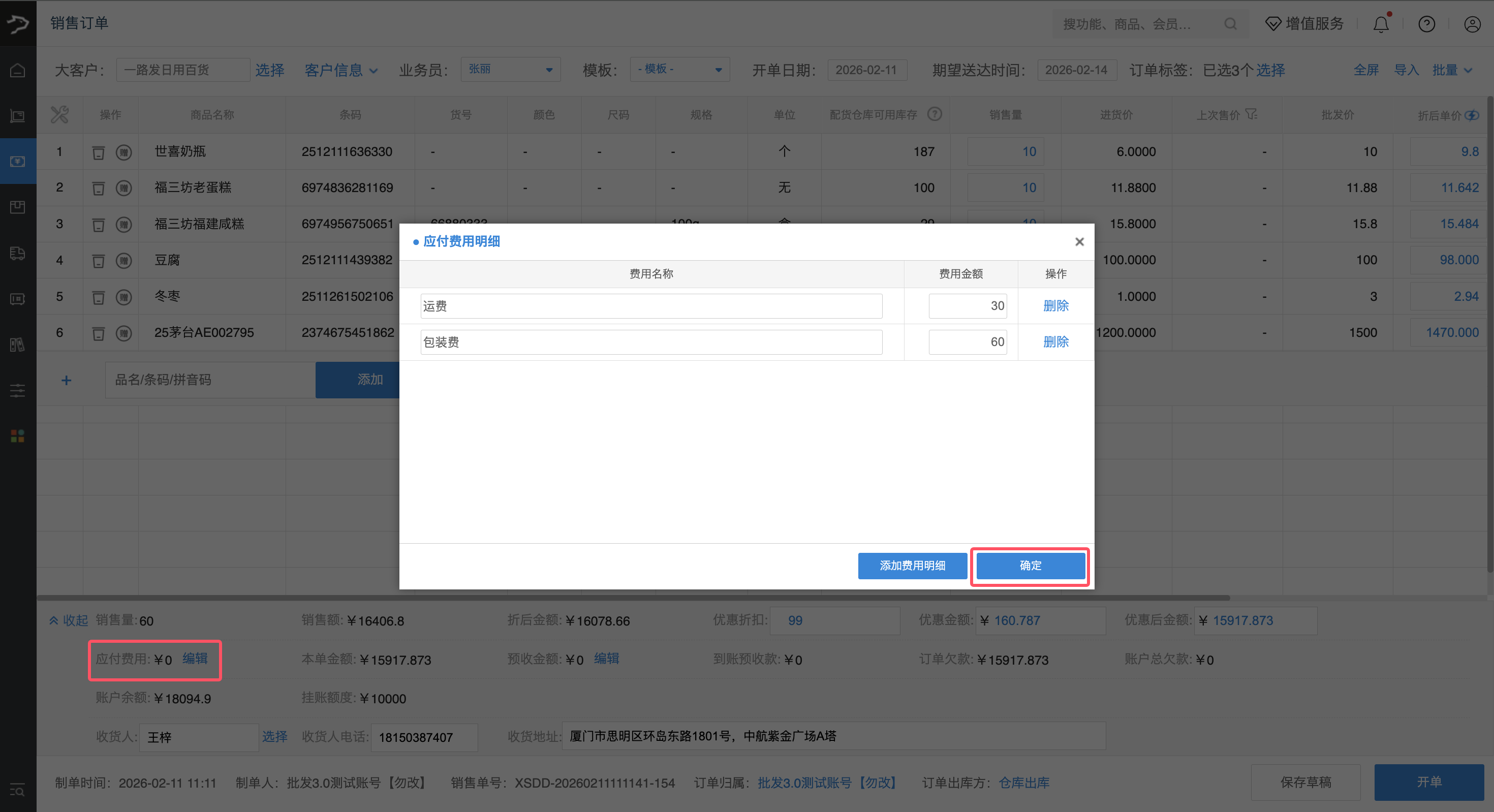 应付费用:可将运费、包装费等其他费用计入订单。点击【应付费用】后的「编辑」按钮,在弹出的明细窗口中填写费用名称与金额;如需添加多笔费用,可点击【添加费用明细】;确认无误后点击【确定】,系统将自动把费用总额计入本单金额。