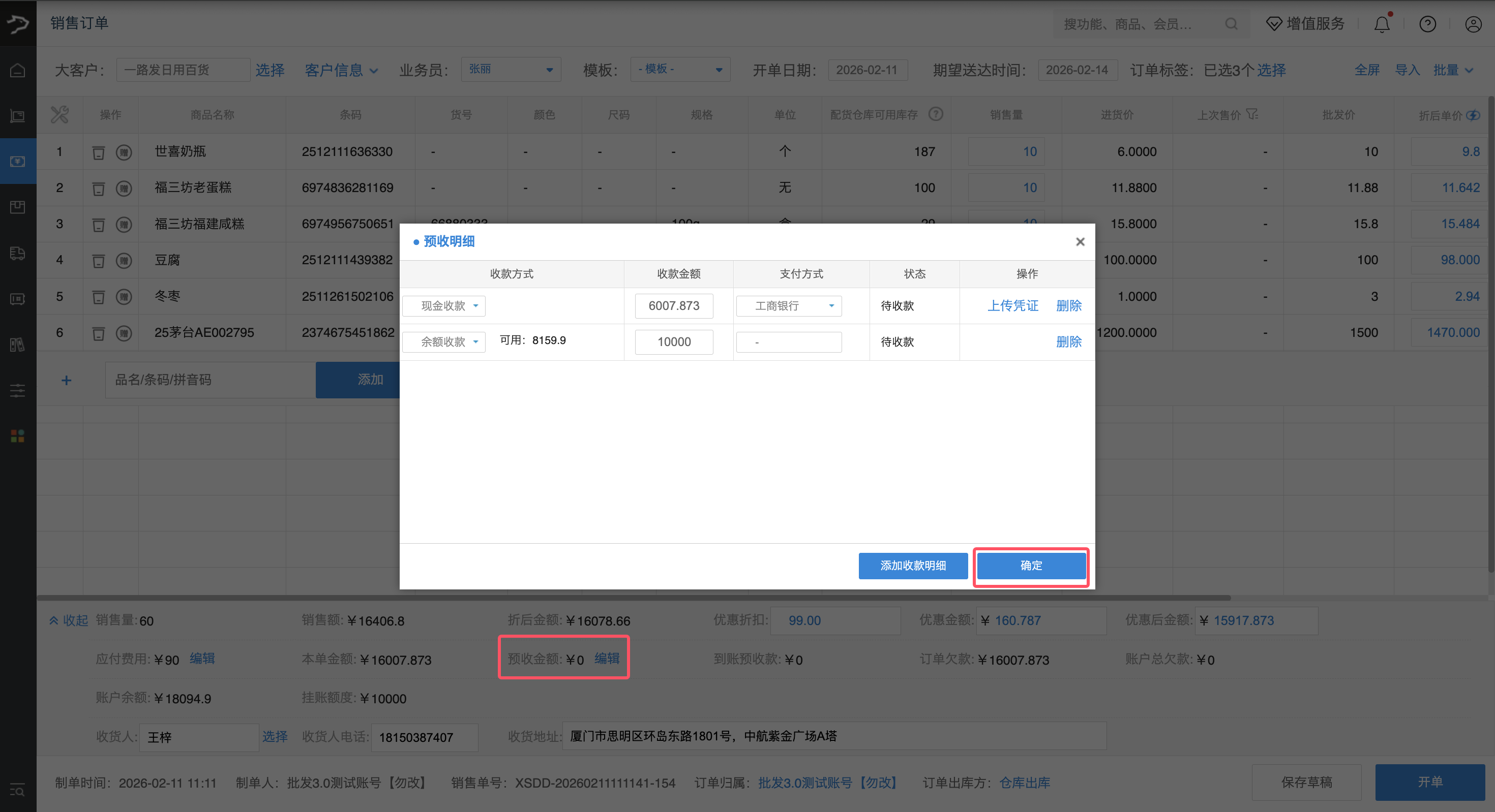预收金额:开单时若已收取客户款项,可点击预收金额后的【编辑】按钮。在预收明细窗口中选择收款方式,填写收款金额并选择支付方式,支持上传收款凭证(最多 5 张,单张不超过 50M)。如需添加多笔收款,可点击【添加收款明细】,确认后点击【确定】,系统将自动更新账预收款与订单欠款。