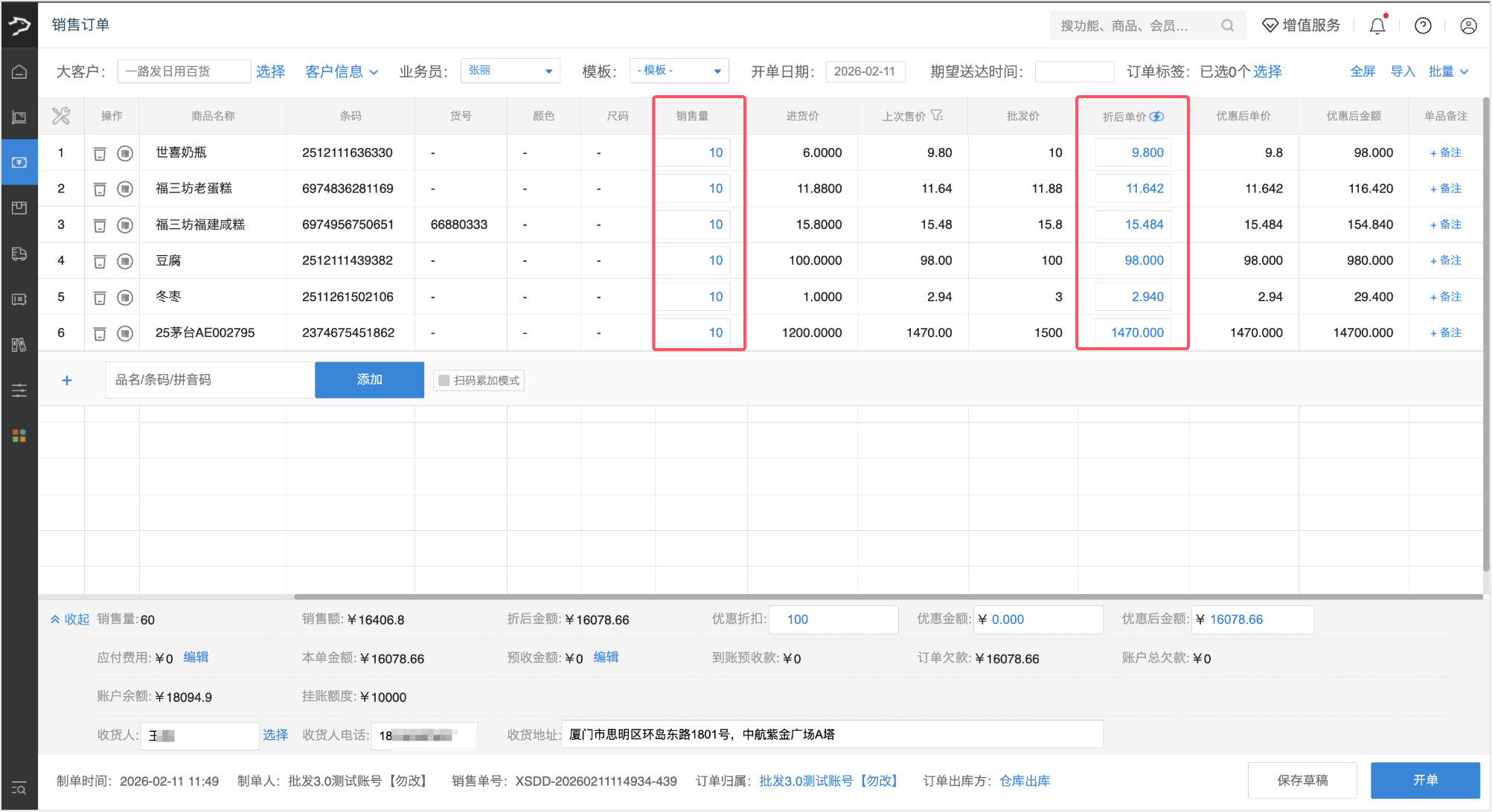 编辑数量与折后单价:直接输入销售量、折后单价。
