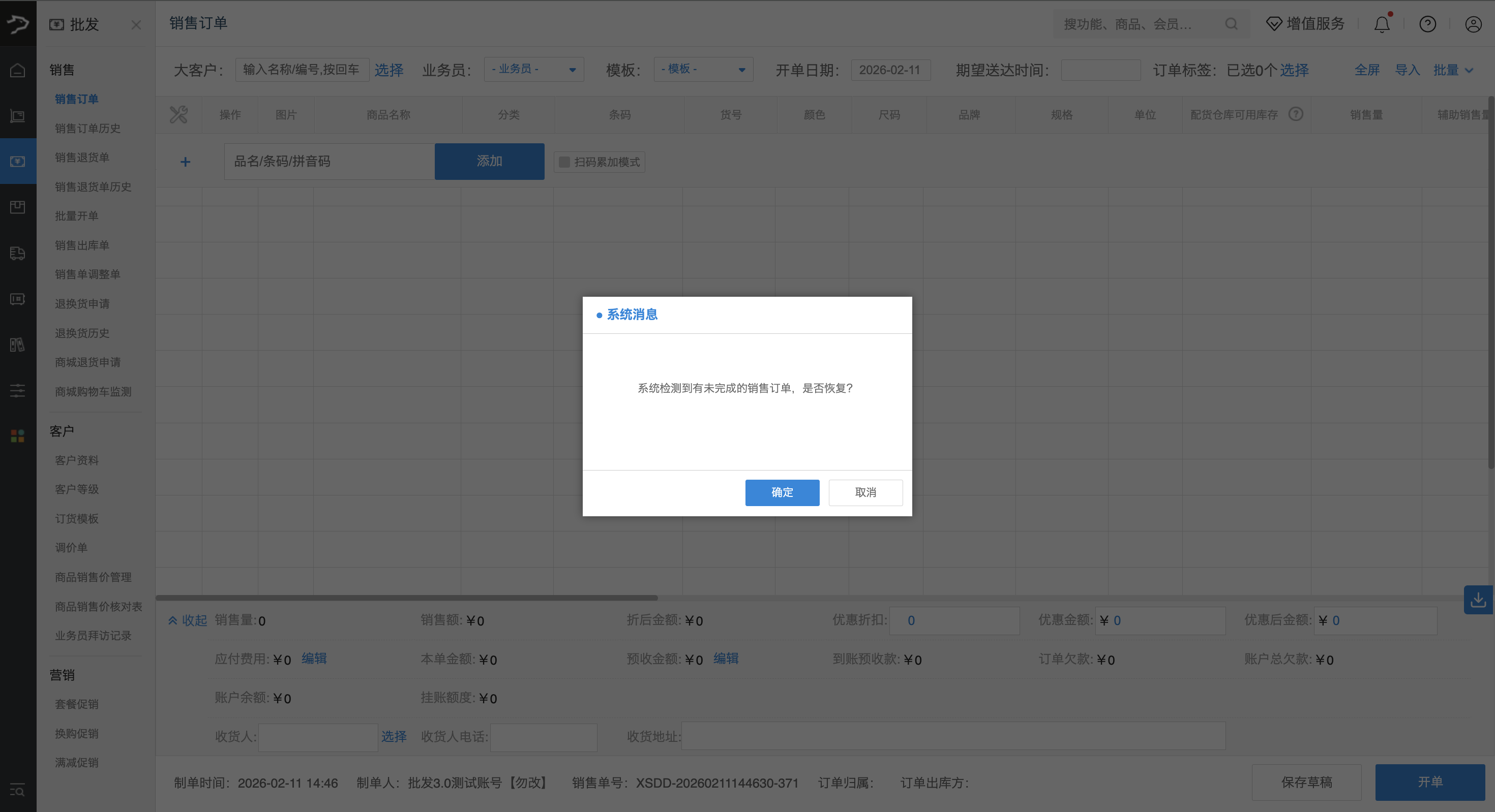 若订单未编辑完成,可点击【保存草稿】暂存内容。再次进入销售订单页面,系统将提示 “检测到未完成订单,是否恢复?”,点击【确定】即可加载草稿,继续编辑后提交。