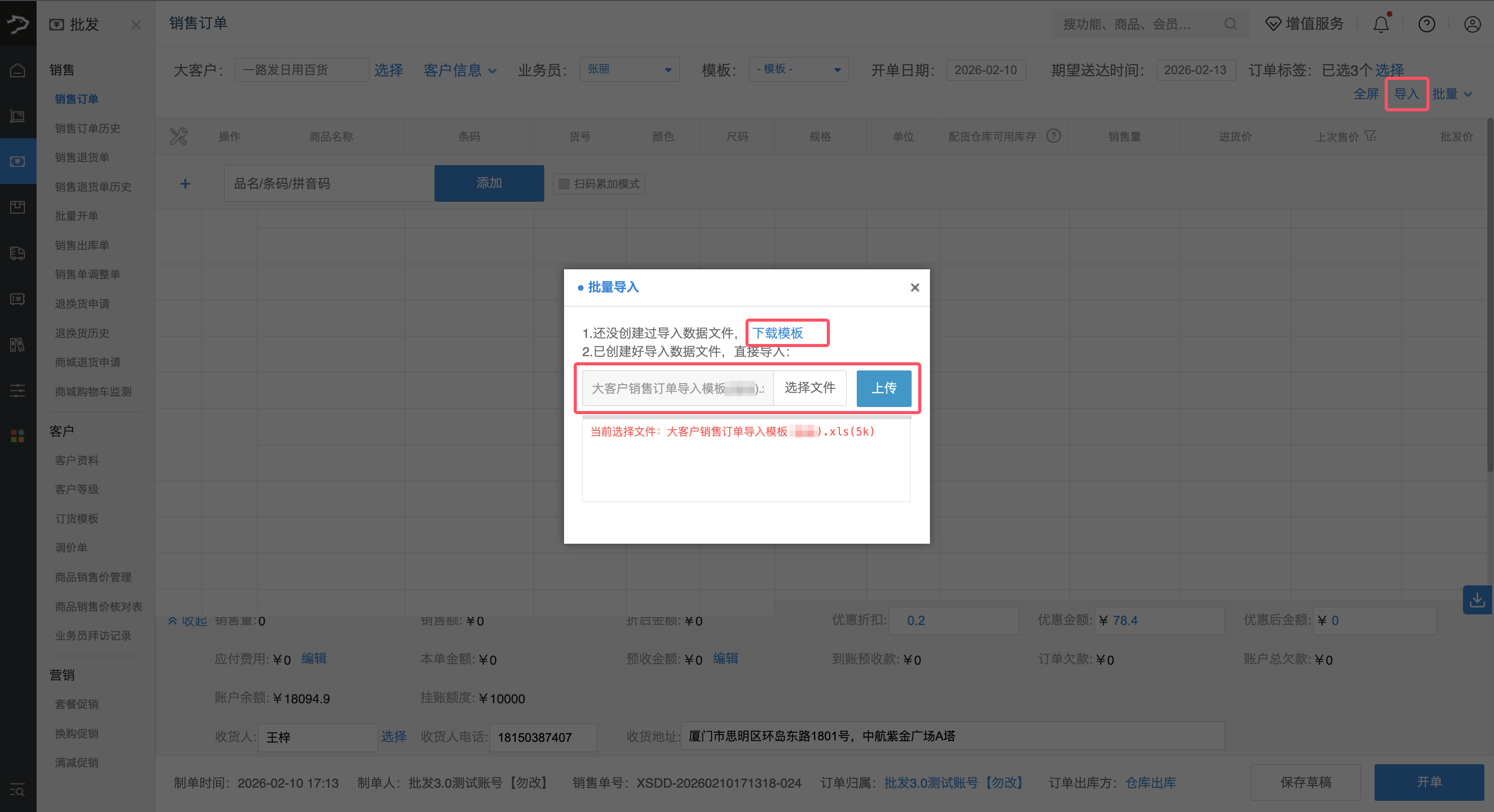 • 批量导入:点击右上角【导入】按钮,下载并填写大客户销售订单导入模板后上传,快速批量开单。