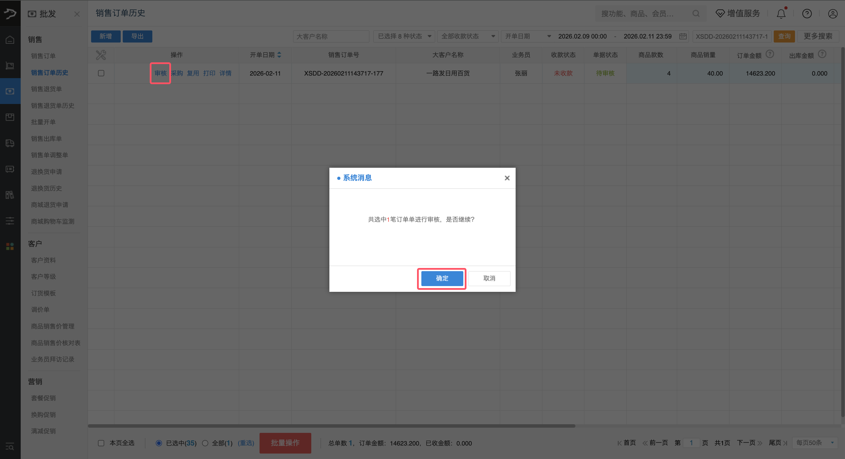 系统弹出确认提示 “共选中 N 笔订单进行审核,是否继续?”,点击【确定】。