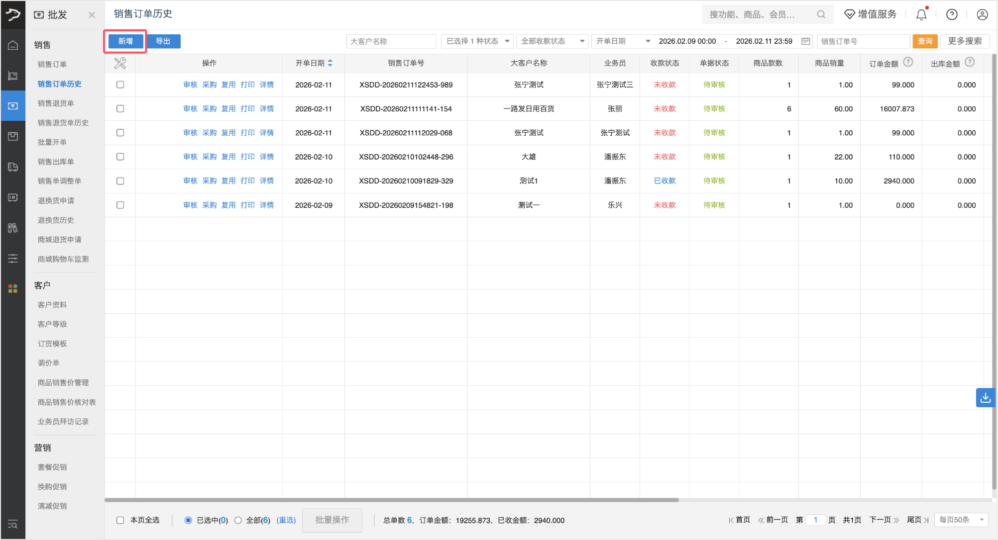 新增订单:点击页面左上角【新增】按钮,跳转至销售订单开单页面,快速创建新订单。