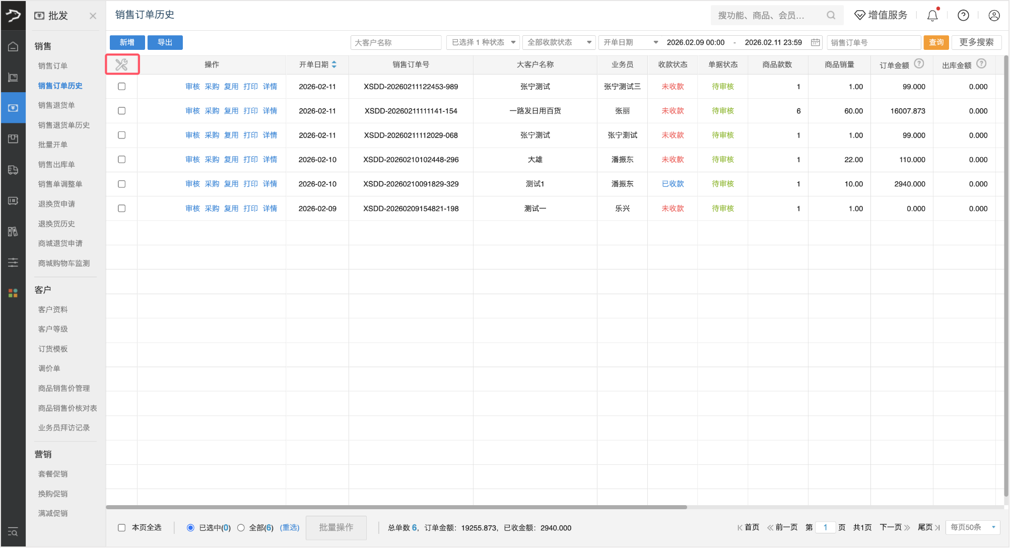 用于管理和查询所有批发销售订单,支持按客户、日期、状态等条件筛选单据,并可对订单进行审核、采购、复用、打印、查看详情等操作,帮助您高效追踪和处理批发业务全流程。