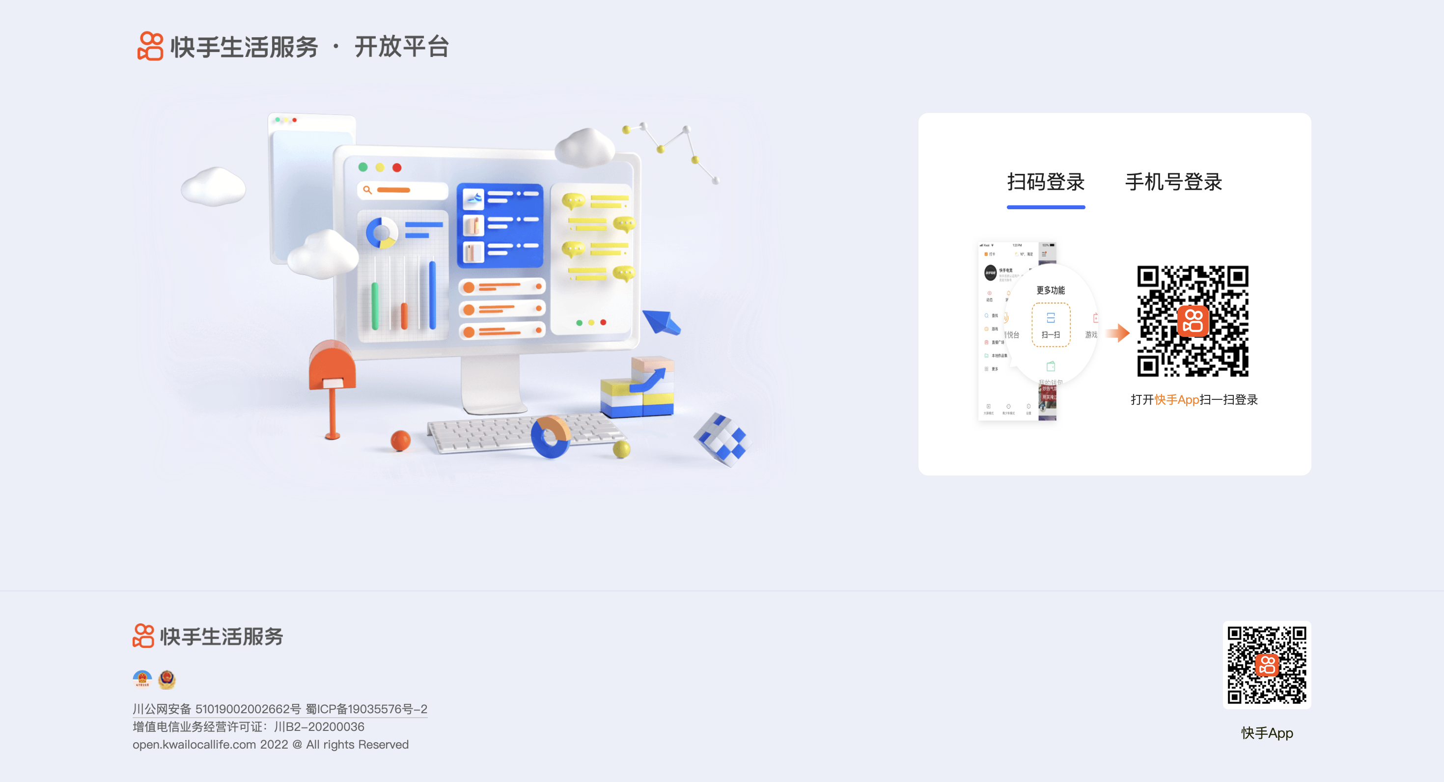 进入快手本地生活开放平台:https://open.kwailocallife.com/home/application/appList ,可通过快手APP扫码登录、或通过快手账号的手机号密码登录、或通过手机号验证码登录。
