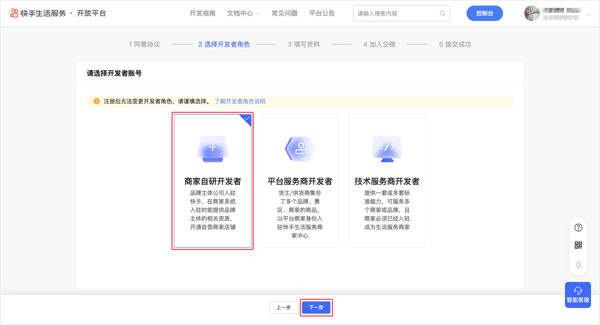 开发角色选择“ 商家自研开发者 ”,点击【下一步】。
