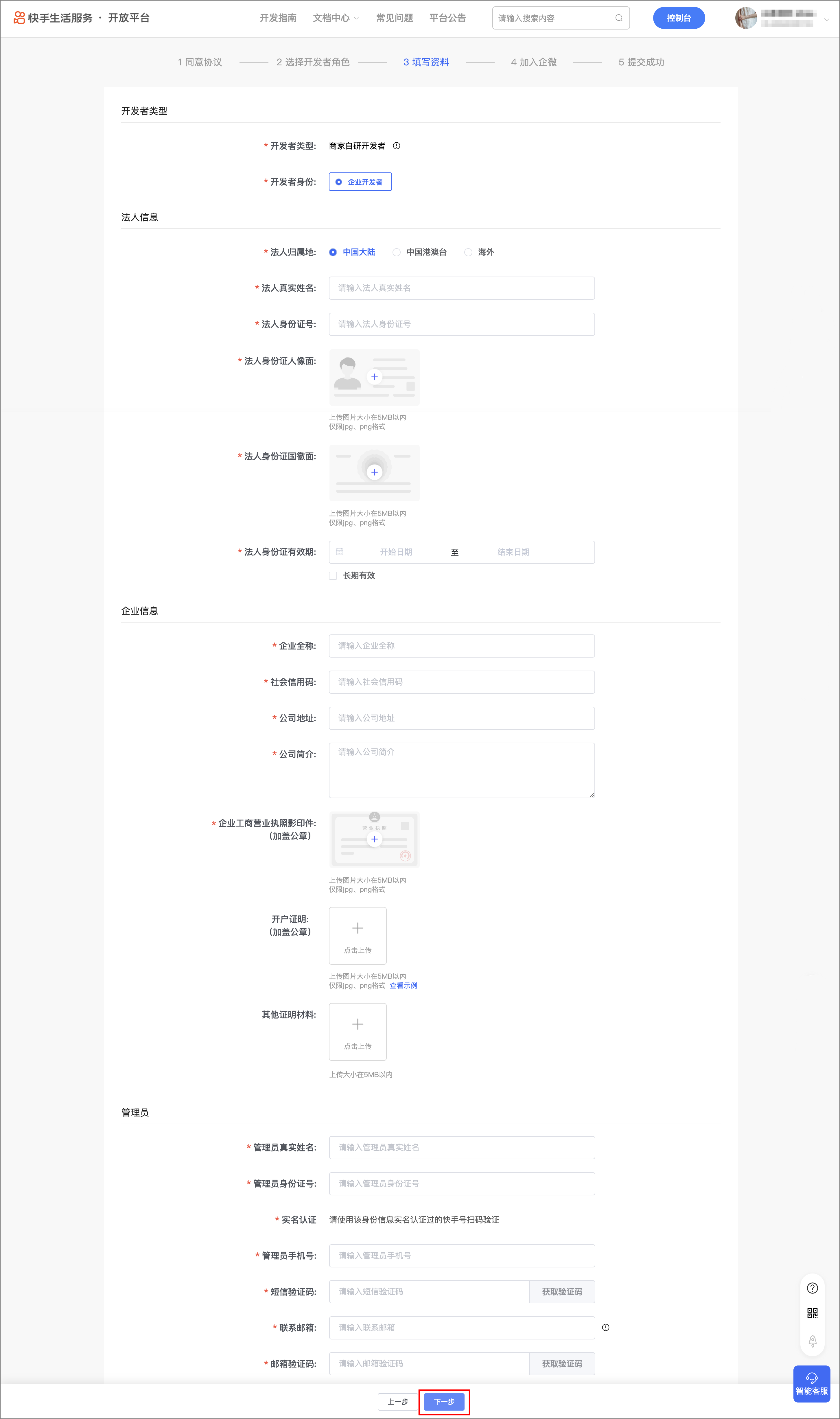 按页面提示填写入驻资料,确认资料准确无误后,点击【下一步】。