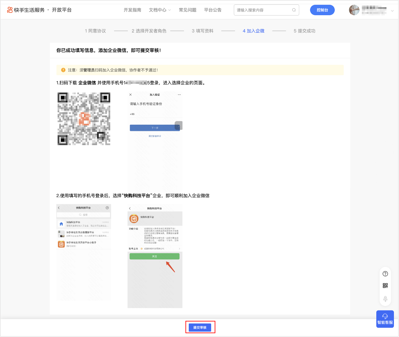 管理员扫码加入企微,点击【提交审核】。