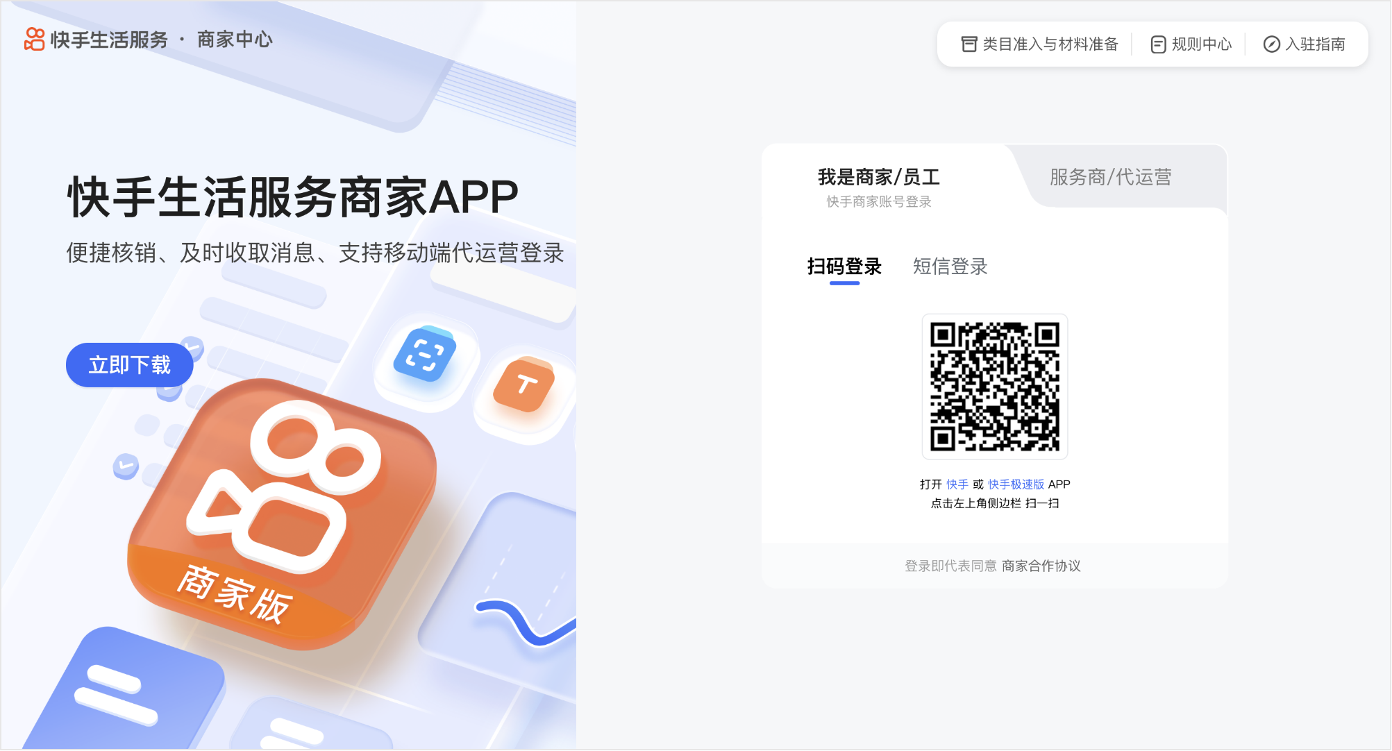 进入快手本地生活商家:https://lbs.kuaishou.com/ll/merchant/login,选择【我是商家/员工】,按页面提示提交营业执照、门店信息、行业资质等资料,完成审核后即可入驻。