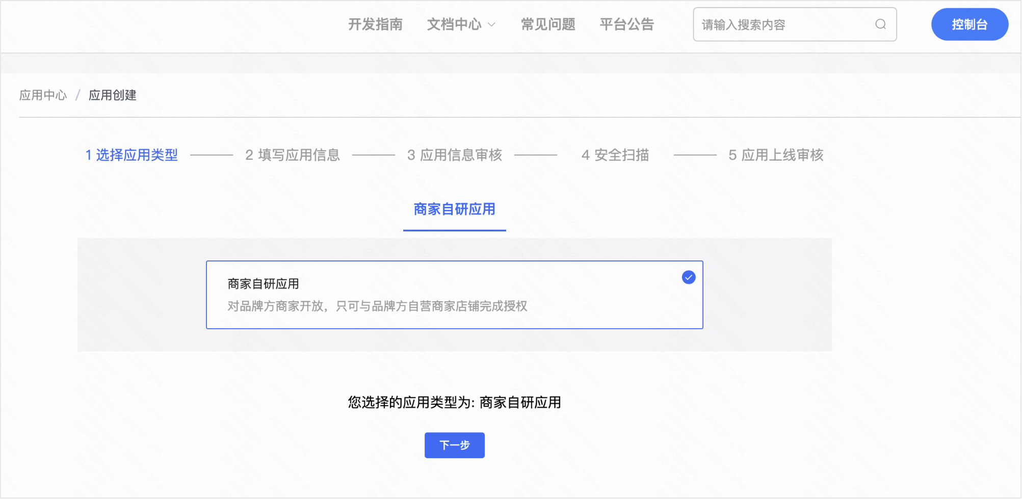 选择【 商家自研应用 】,点击【下一步】。