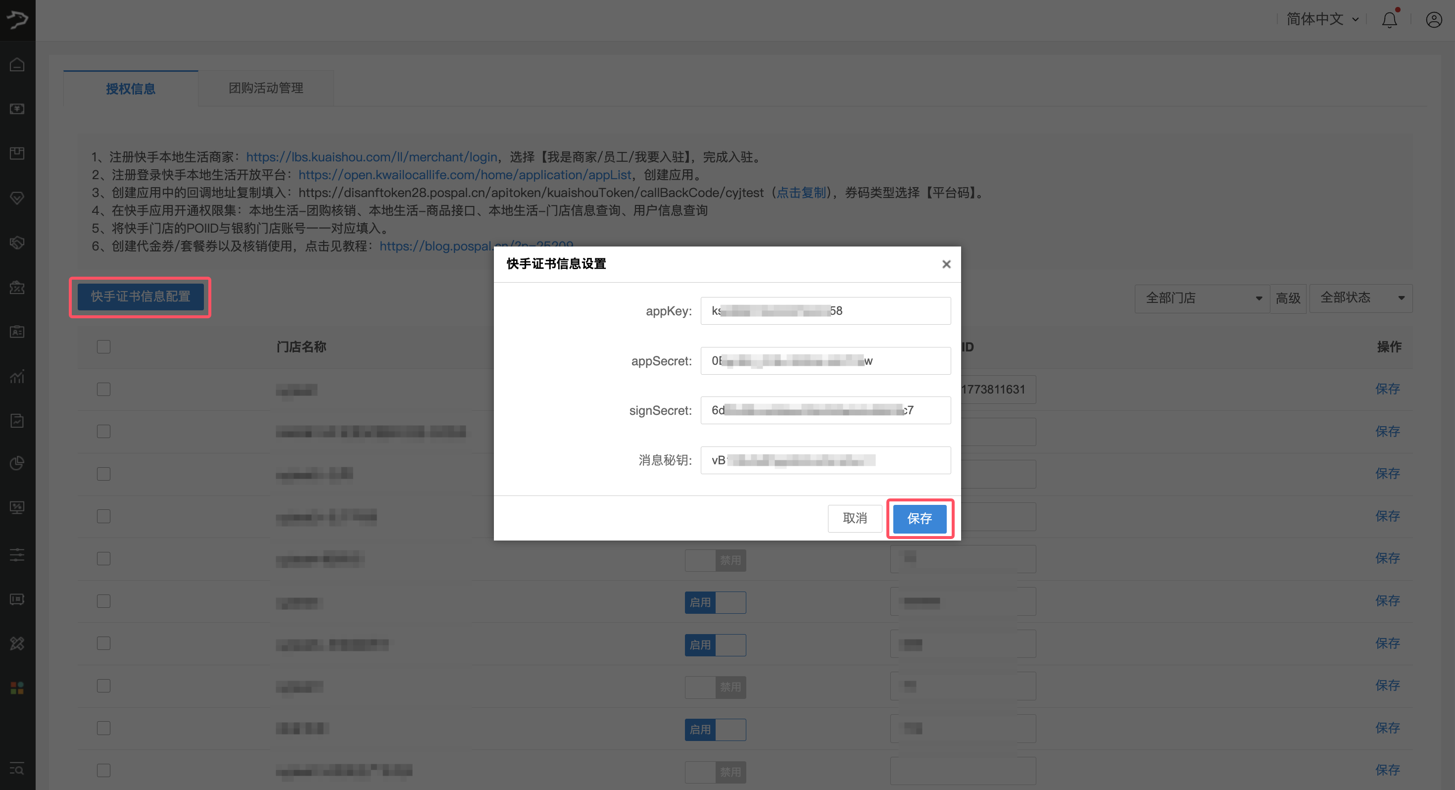 2、登录银豹后台(若为连锁店则登录总部),进入快手团购页面。点击【快手证书信息配置】,将从快手开放平台获取的 appKey、appSecret、signSecret、消息秘钥粘贴至相应位置,最后保存。
