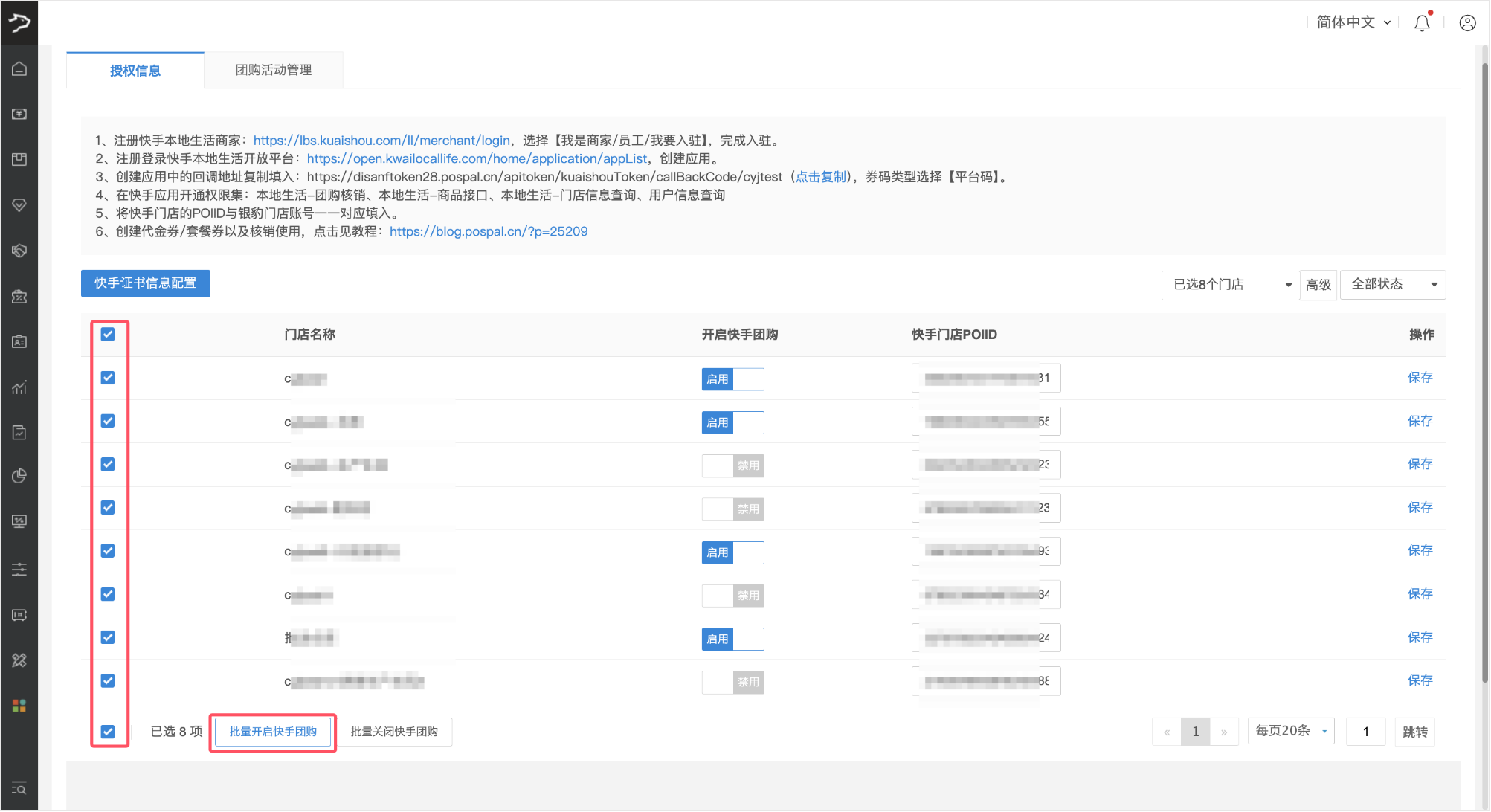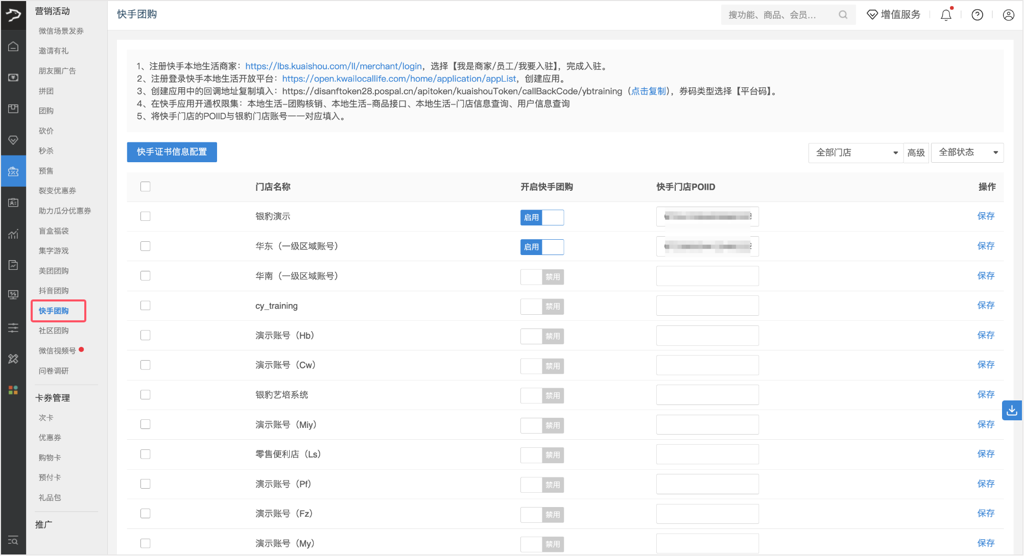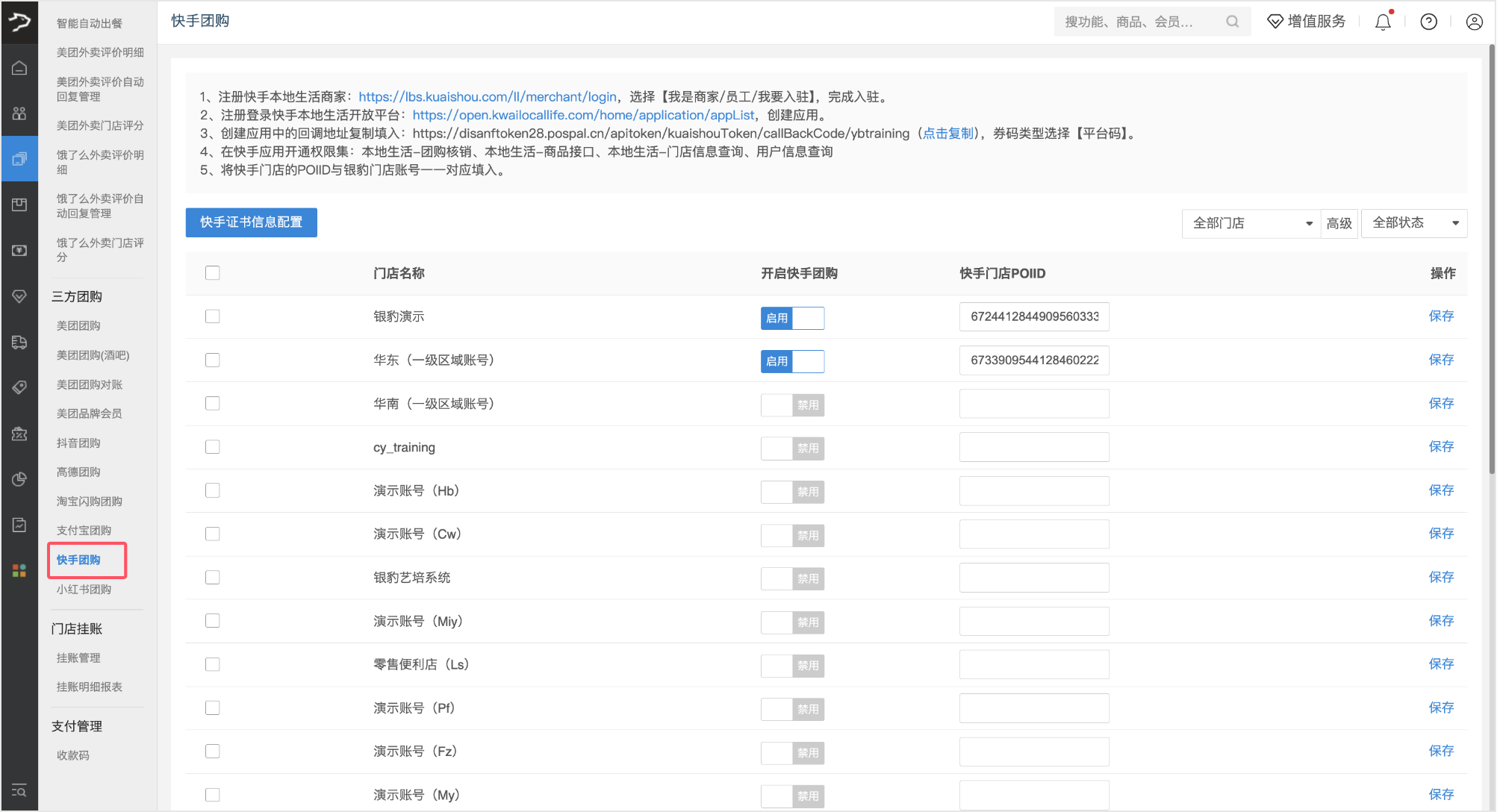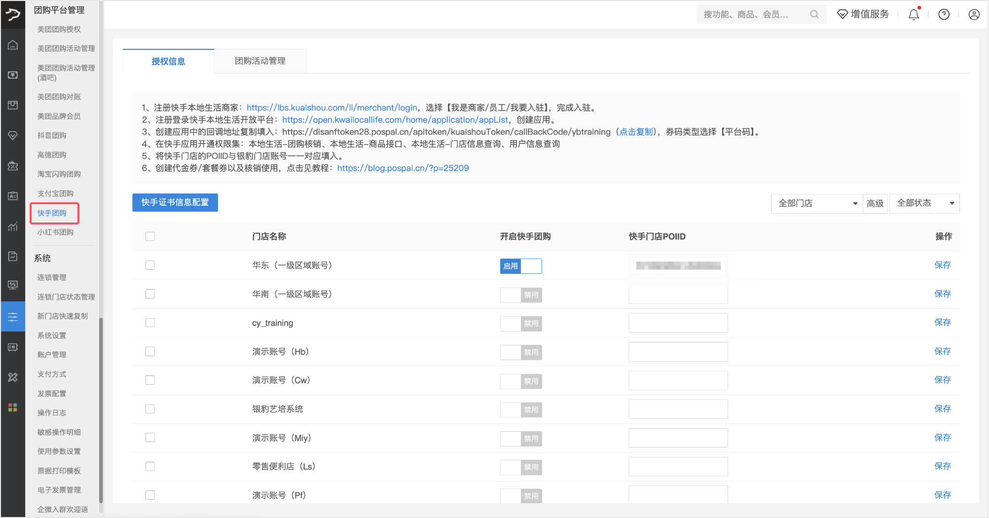 单店开启:在对应门店行的【开启快手团购】列,点击【启用】按钮,然后点击【保存】。