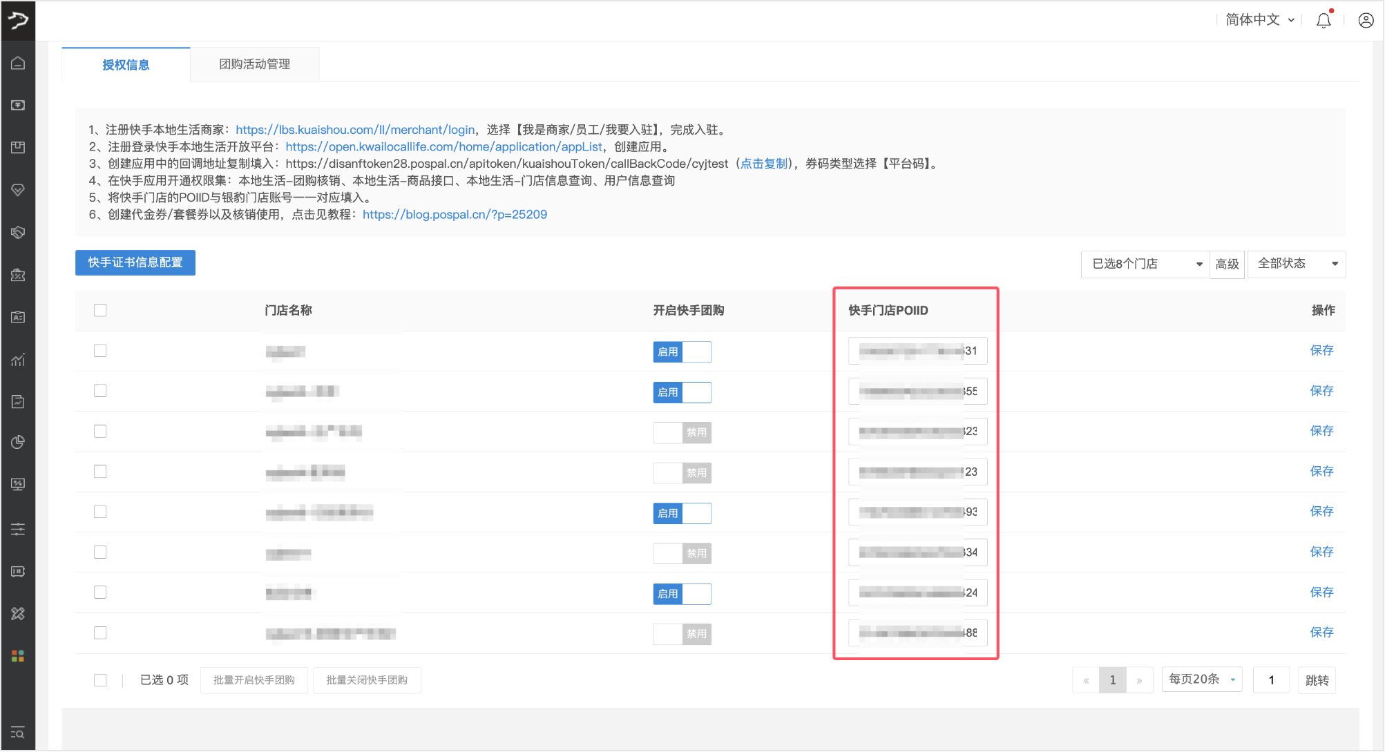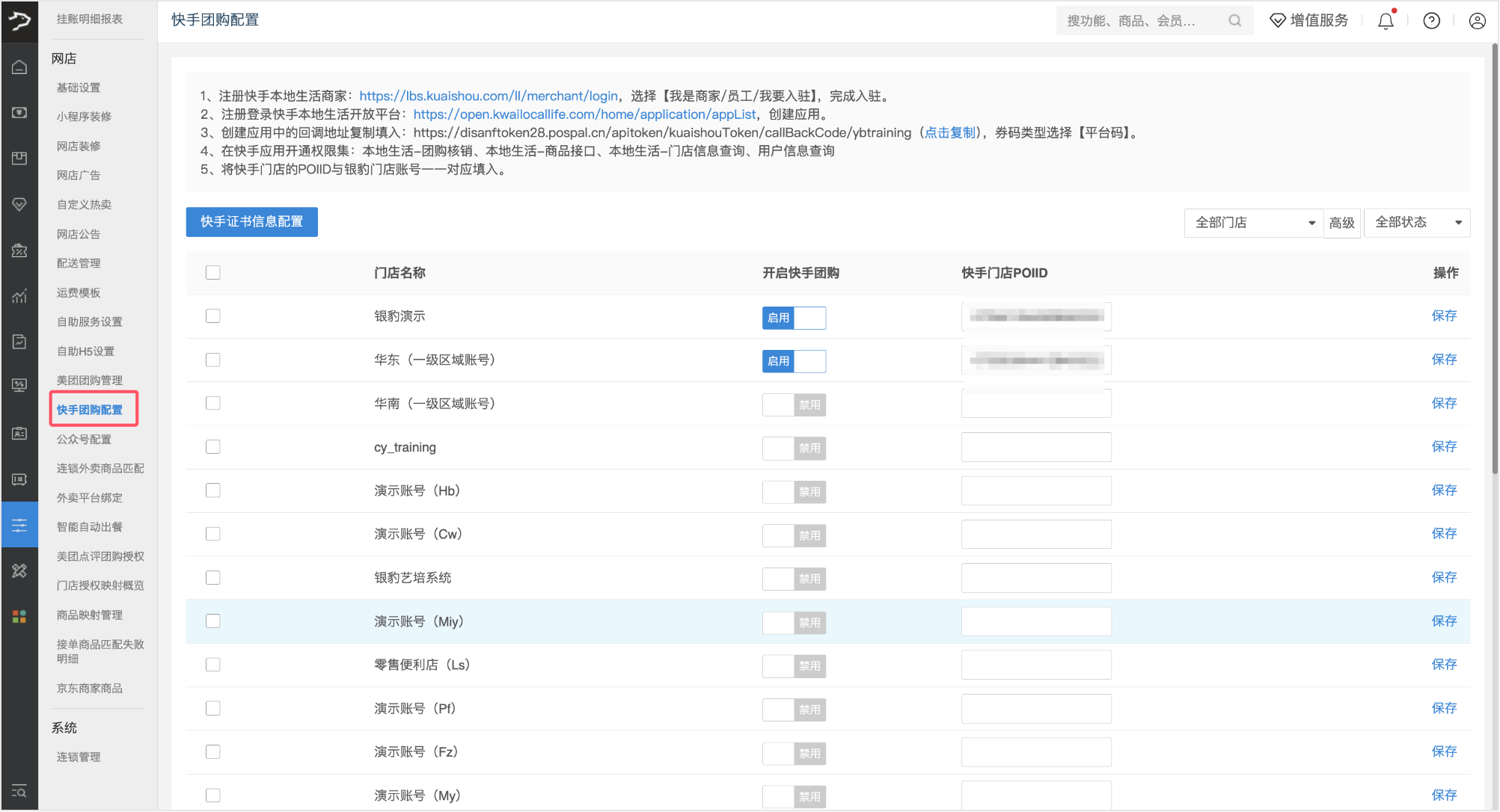 2、在列表中找到对应门店,将快手门店 POIID与银豹门店账号一一对应填入对应输入框。