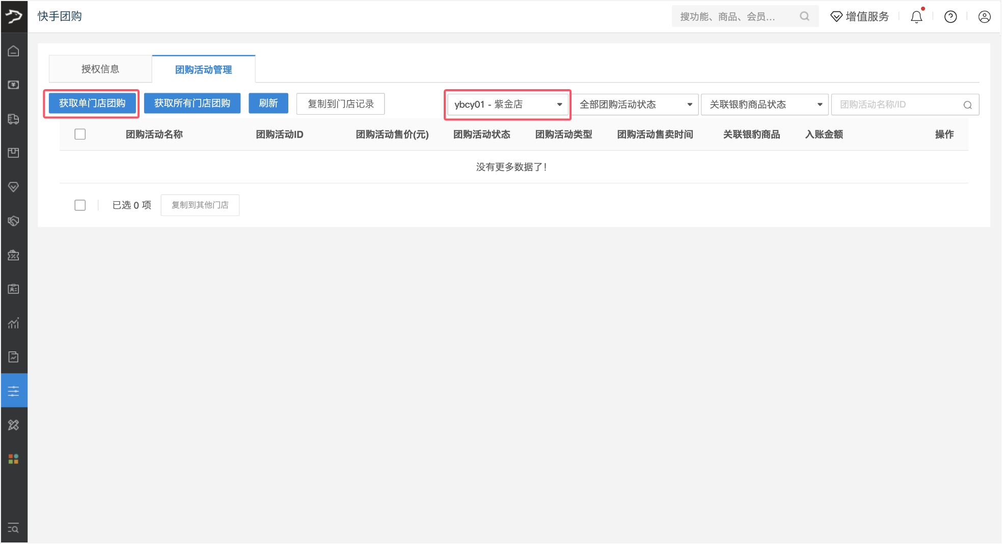 如果是总部账号只获取更新某个门店的团购活动,只需要选择对应的门店后,点击【获取单门店团购】。