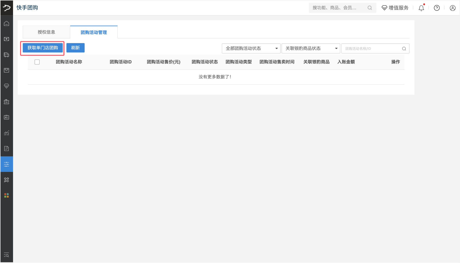 完成授权或快手商户平台更新了团购活动,需登录银豹后台进入【快手团购】页面的【团购活动管理】标签页操作获取门店团购活动。