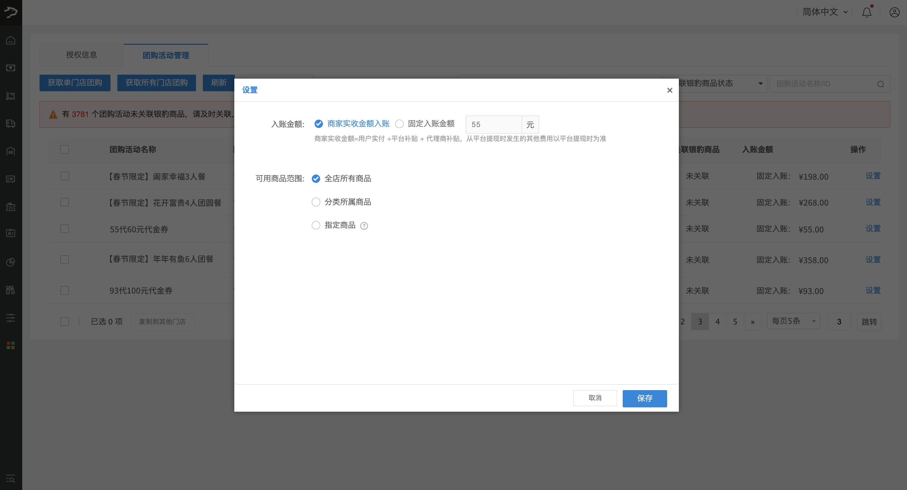 团购活动关联银豹商品时,商家可按需选择团购活动的入账类型: