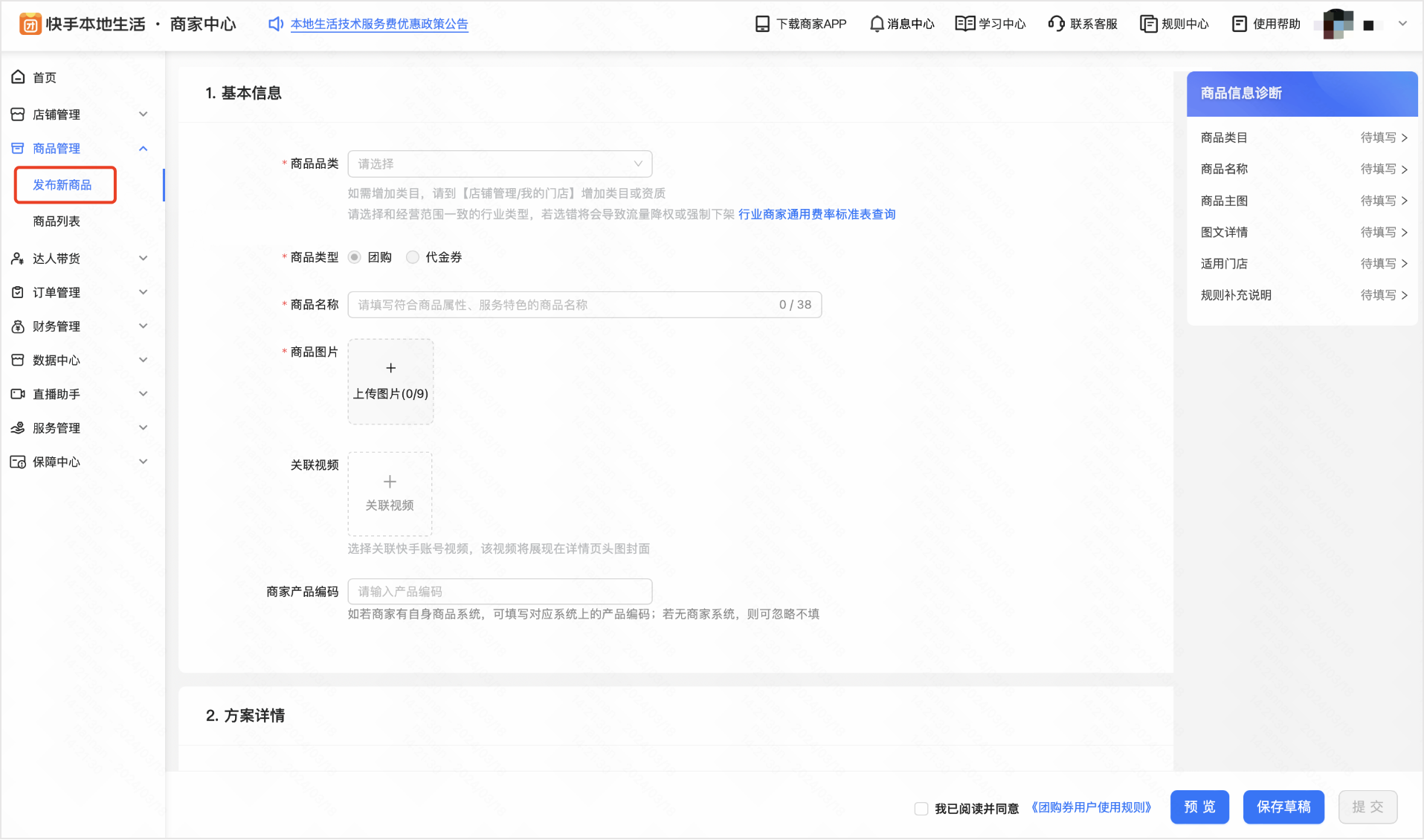 快手商家后台,商品管理-发布新商品