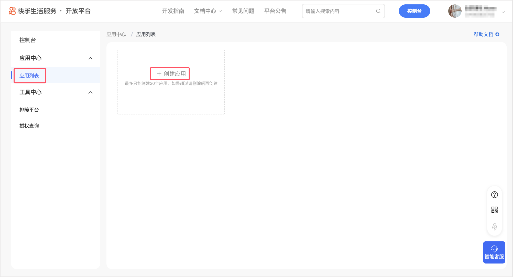 进入「控制台 - 应用中心 - 应用列表」页面,点击【创建应用】,即可进入创建应用流程。
