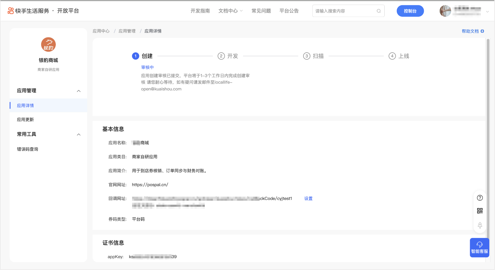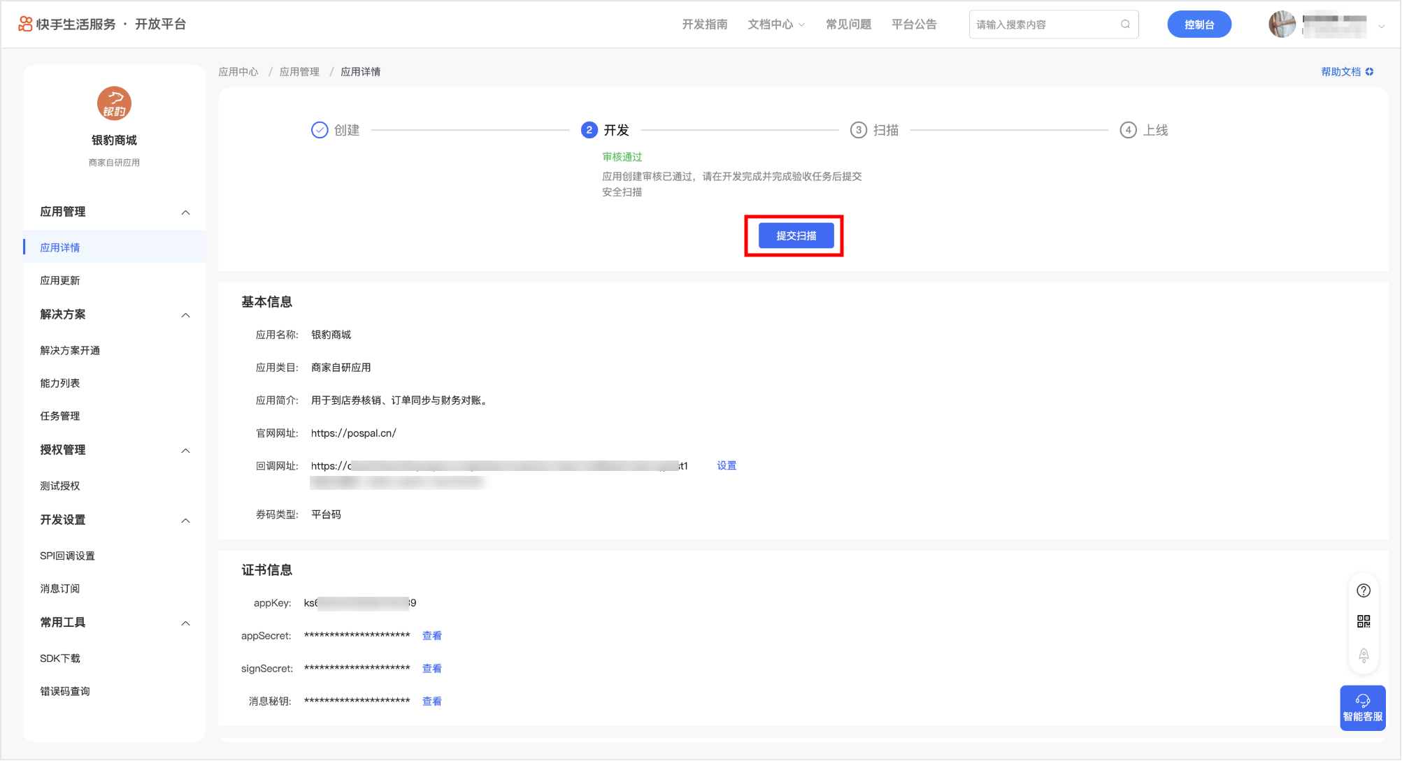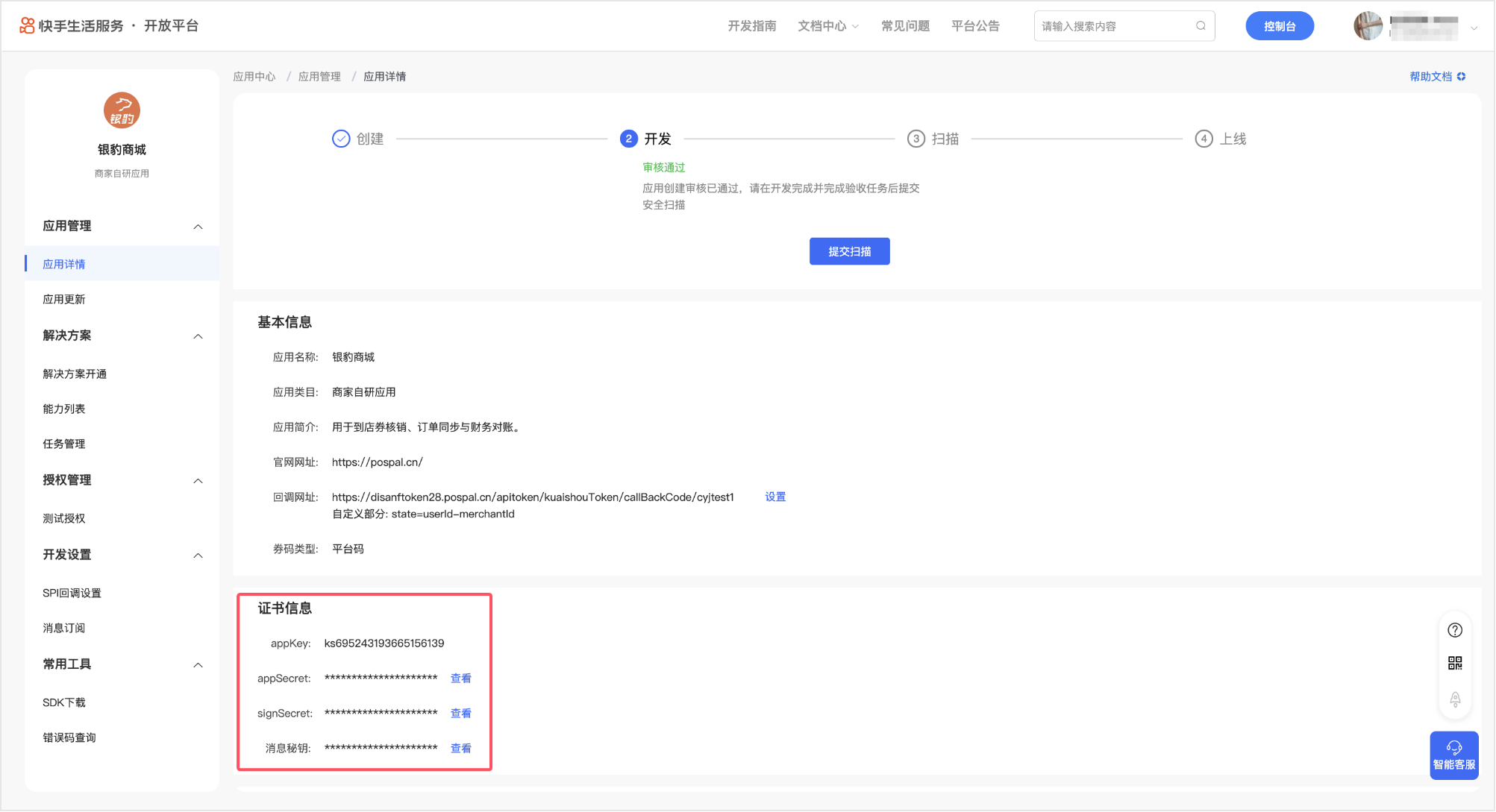 在应用详情中获取 appKey、appSecret、signSecret 参数,用于银豹侧配置快手证书信息。