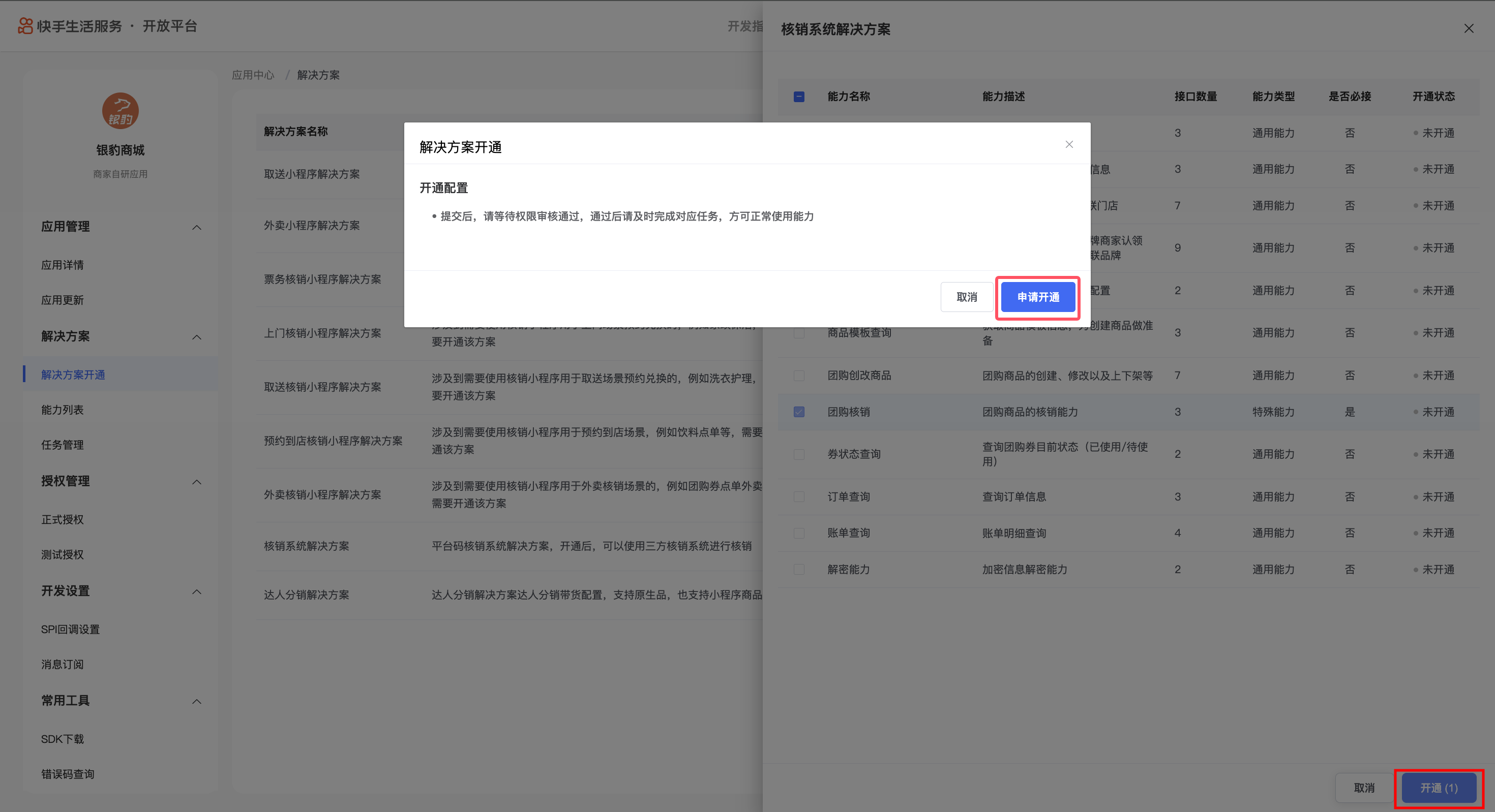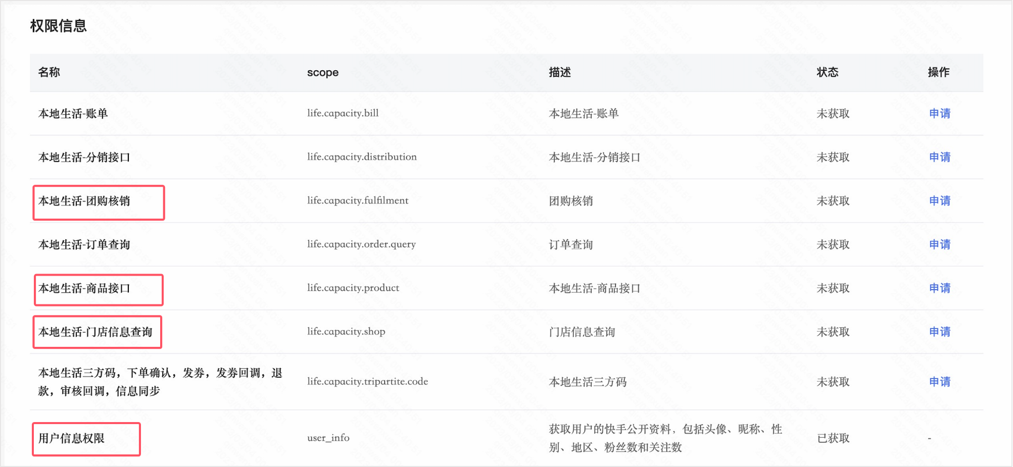 在快手应用开通权限集:本地生活-团购核销、本地生活-商品接口、本地生活-门店信息查询、用户信息查询