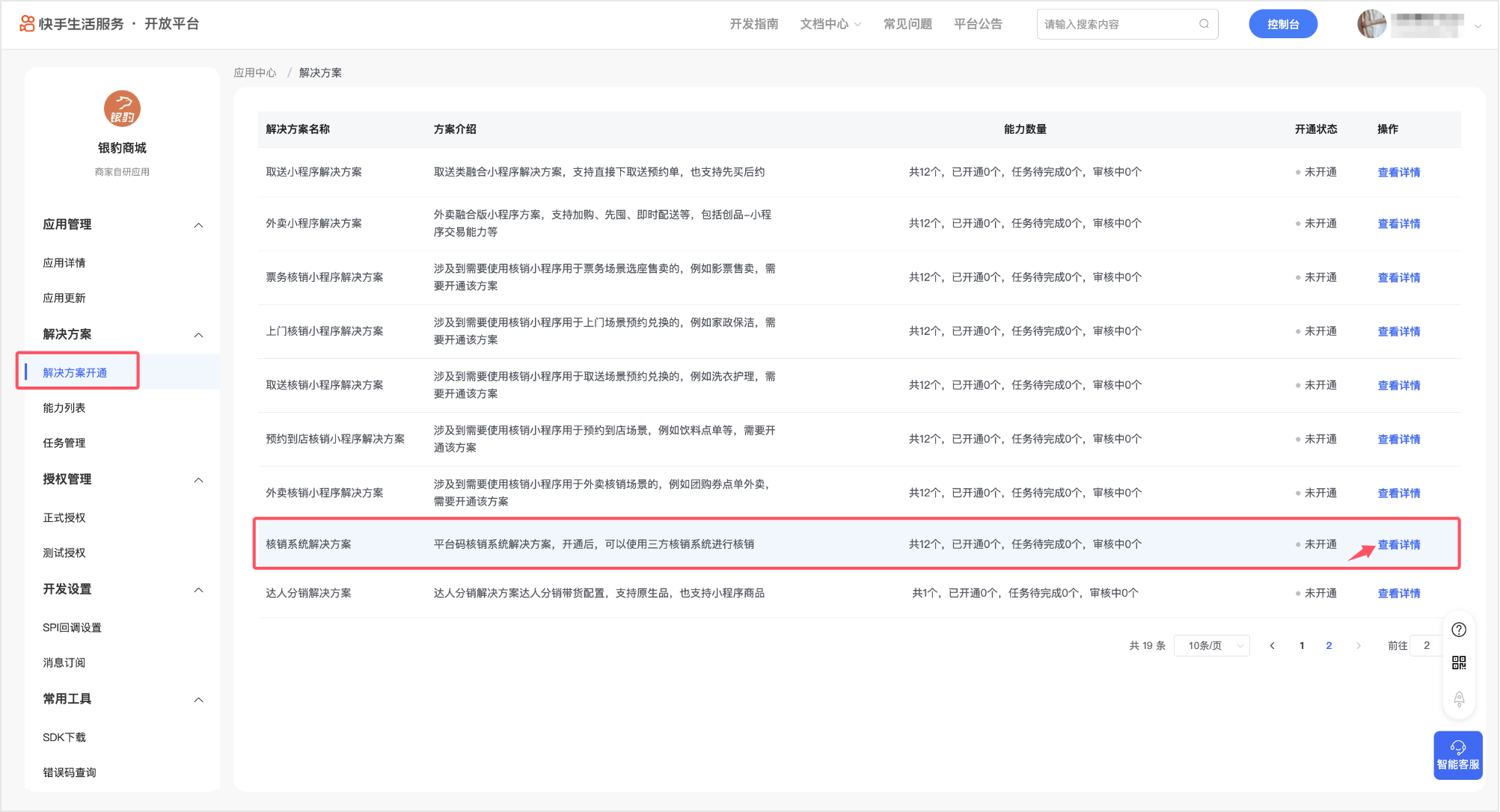 1、进入「解决方案」→「解决方案开通」页面,在解决方案列表中找到「核销系统解决方案」点击右侧的【查看详情】。
