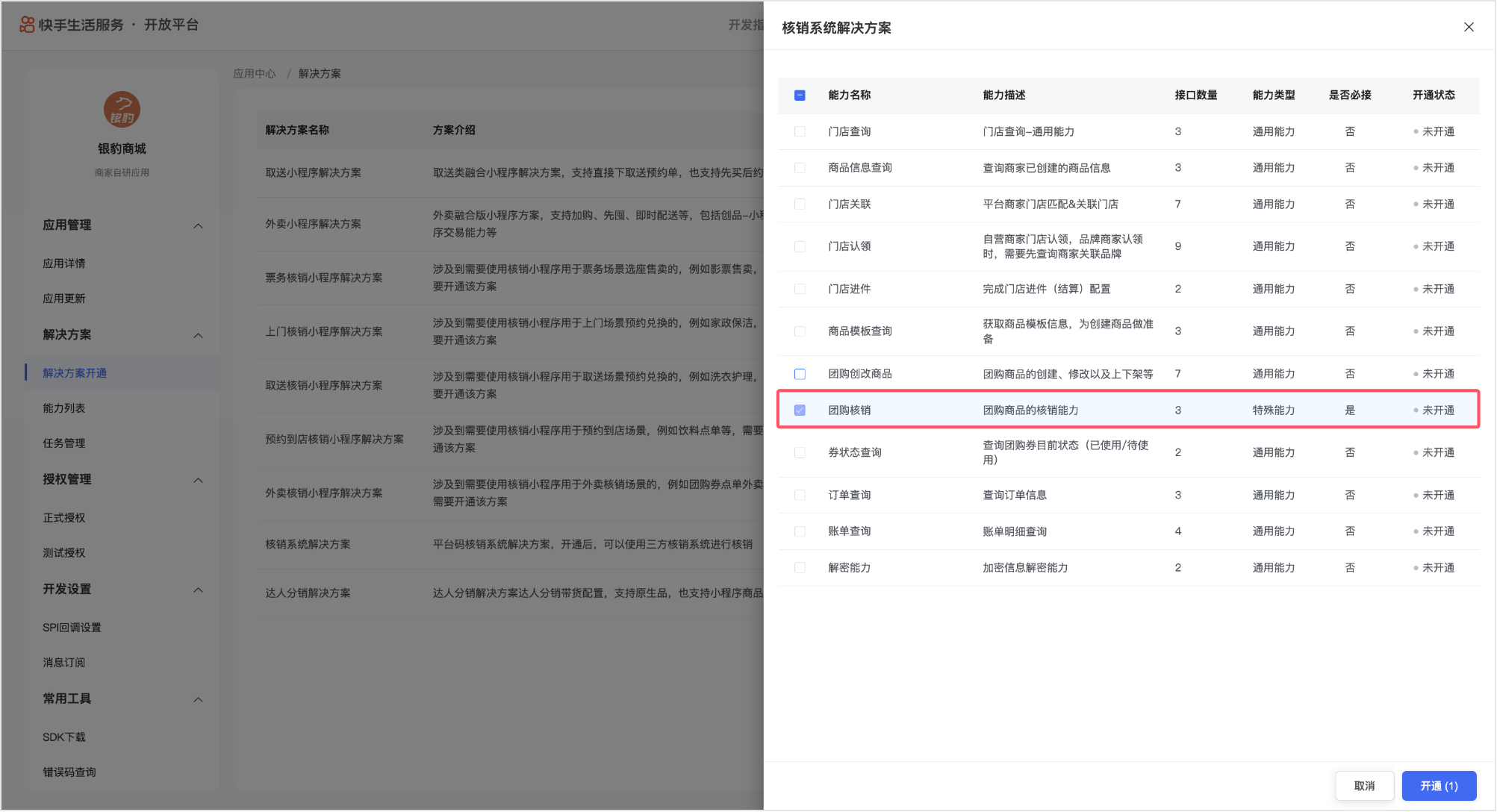 2、在弹出的窗口中,勾选 「团购核销」能力。