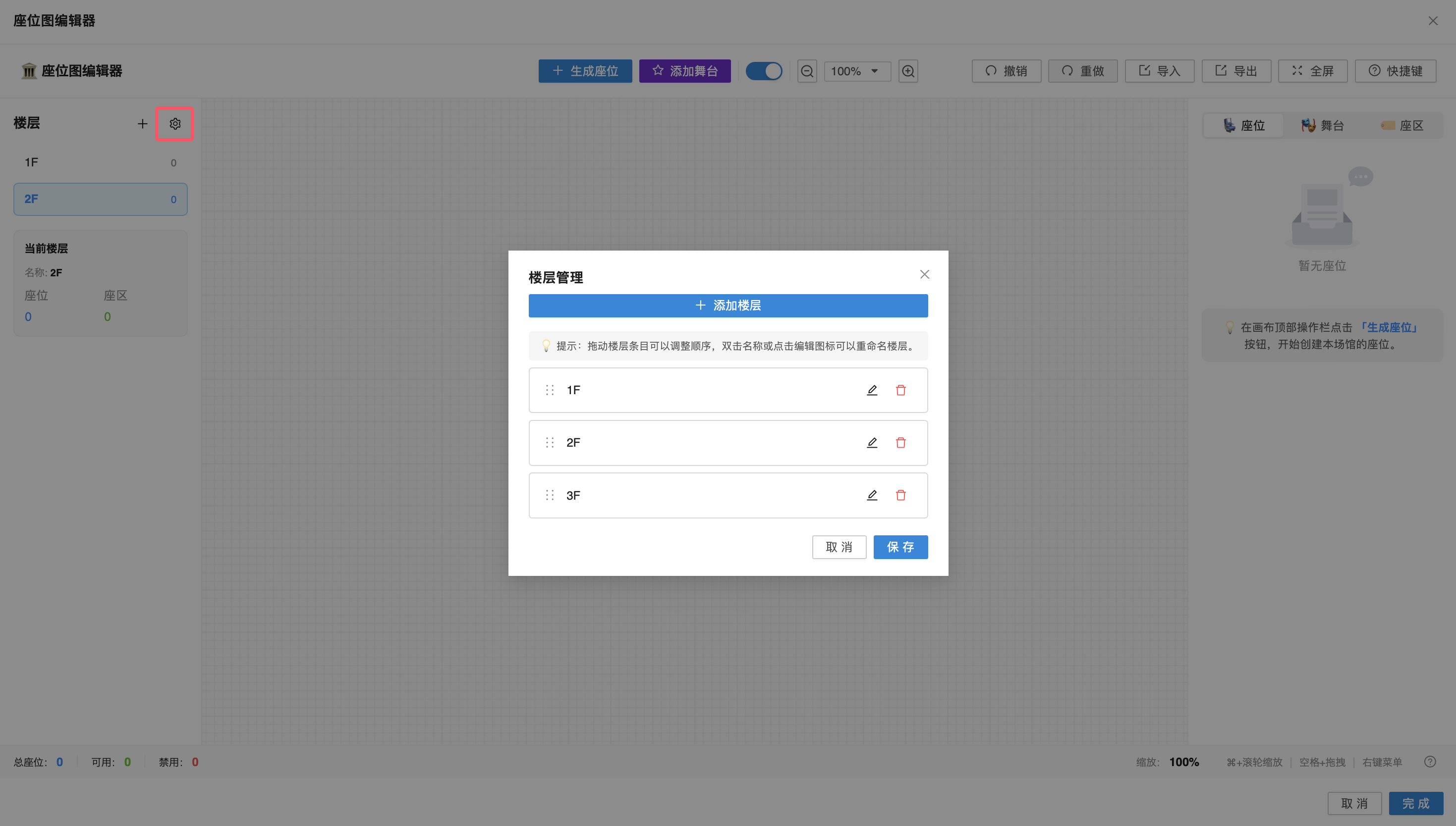 点击左侧「楼层」旁的【+】可快速新建楼层;点击齿轮图标进入「楼层管理」,可添加、重命名、调整顺序或删除楼层,保存后生效。