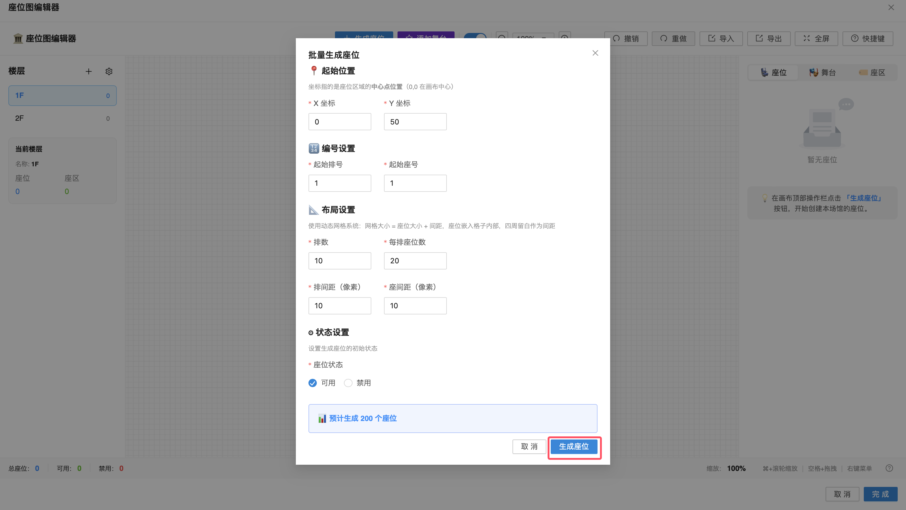 选中目标楼层后,点击画布顶部【生成座位】按钮,在弹窗中配置起始位置、编号设置、布局设置、状态设置,设置好后点击【生成座位】,系统将按设定自动生成对应座位。