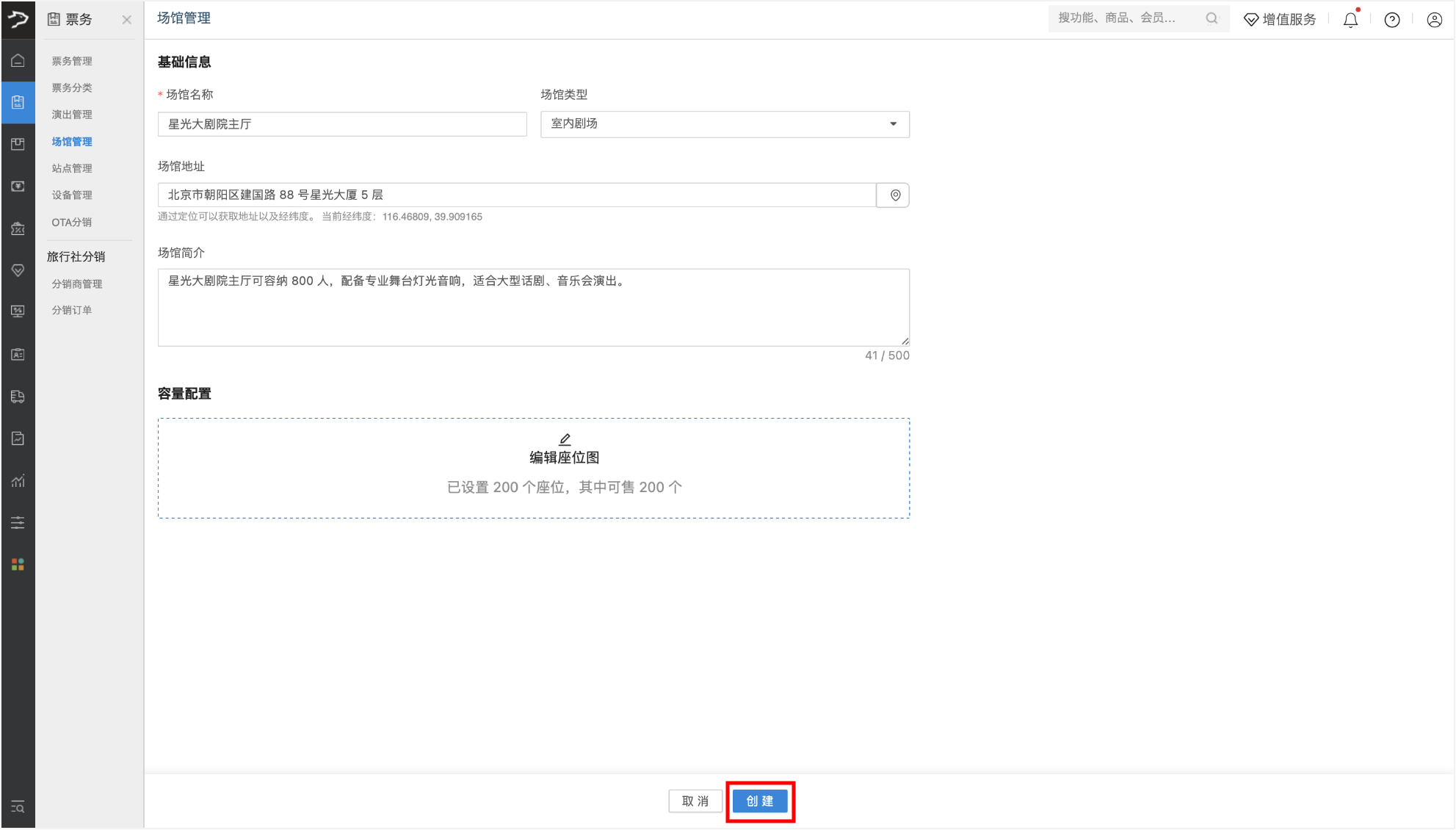 4、完成所有信息编辑后,点击【创建】按钮保存场馆信息。