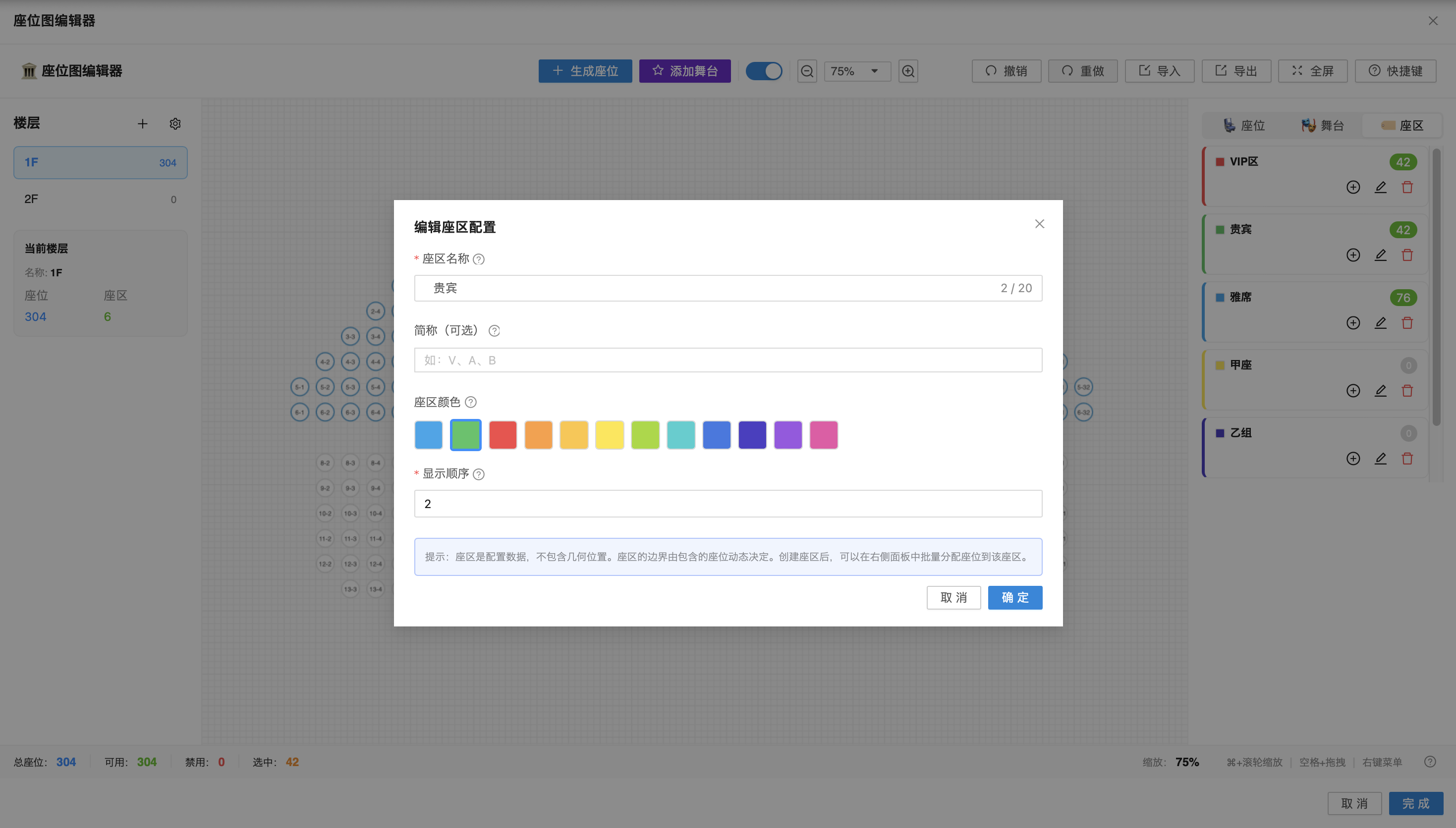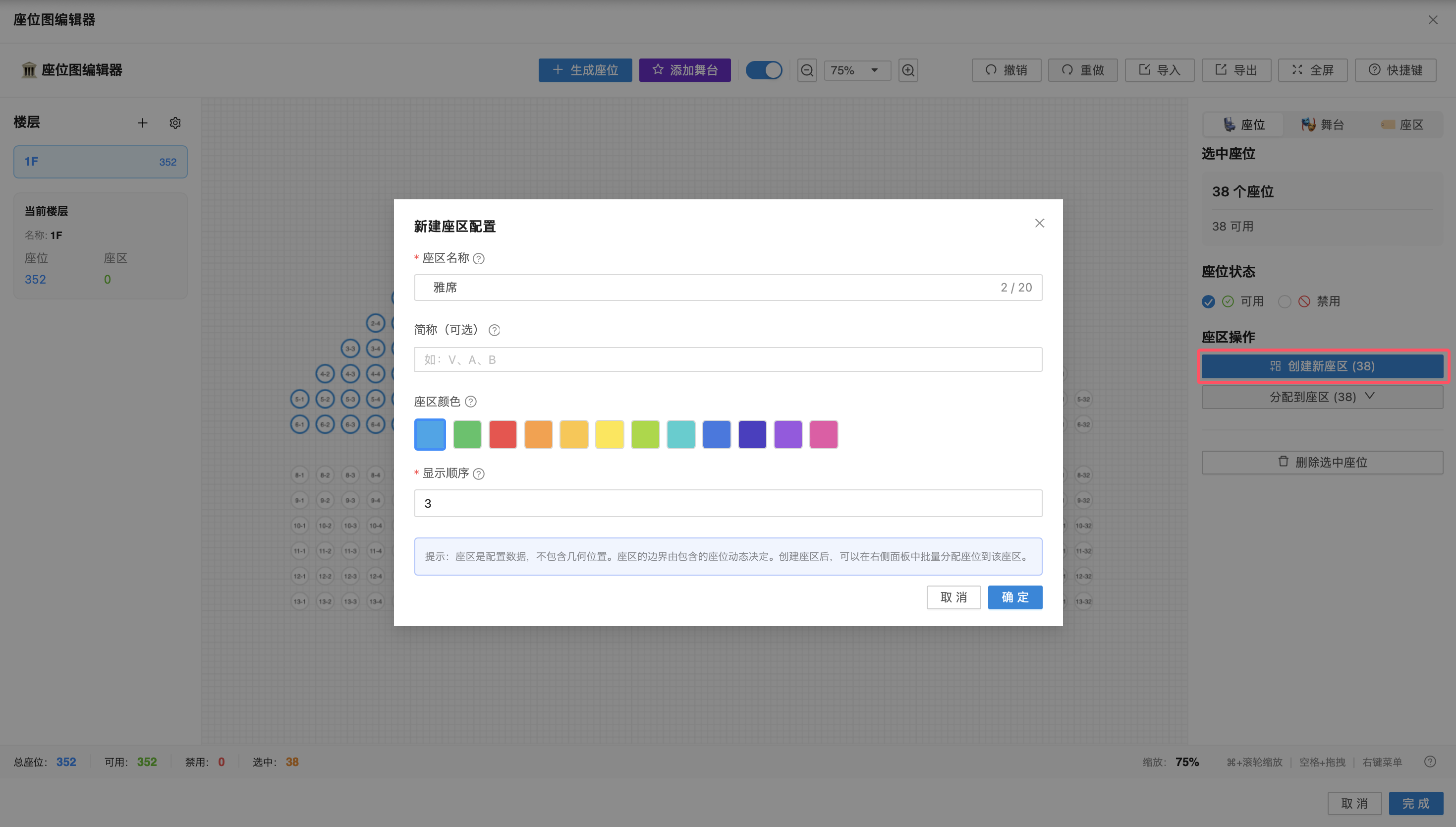 在画布中选中目标座位后,在右侧编辑面板点击【创建新座区】,配置座区名称、简称(可选)、座区颜色及显示顺序,点击【确定】,即可完成座区创建。