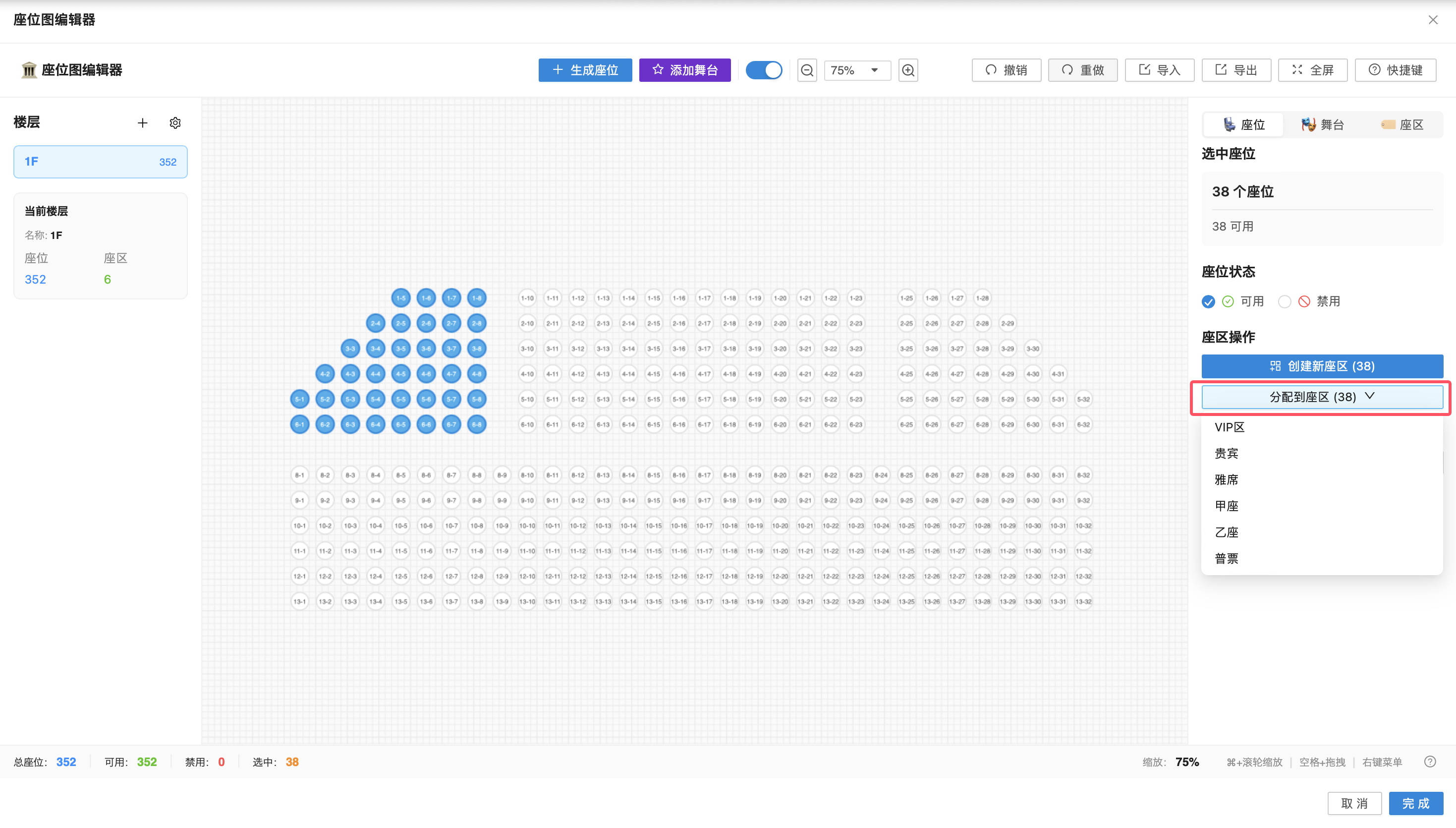 在画布中选中目标座位后,在右侧编辑面板点击【分配到座区】,选择目标座区,即可将选中座位批量分配至该座区。