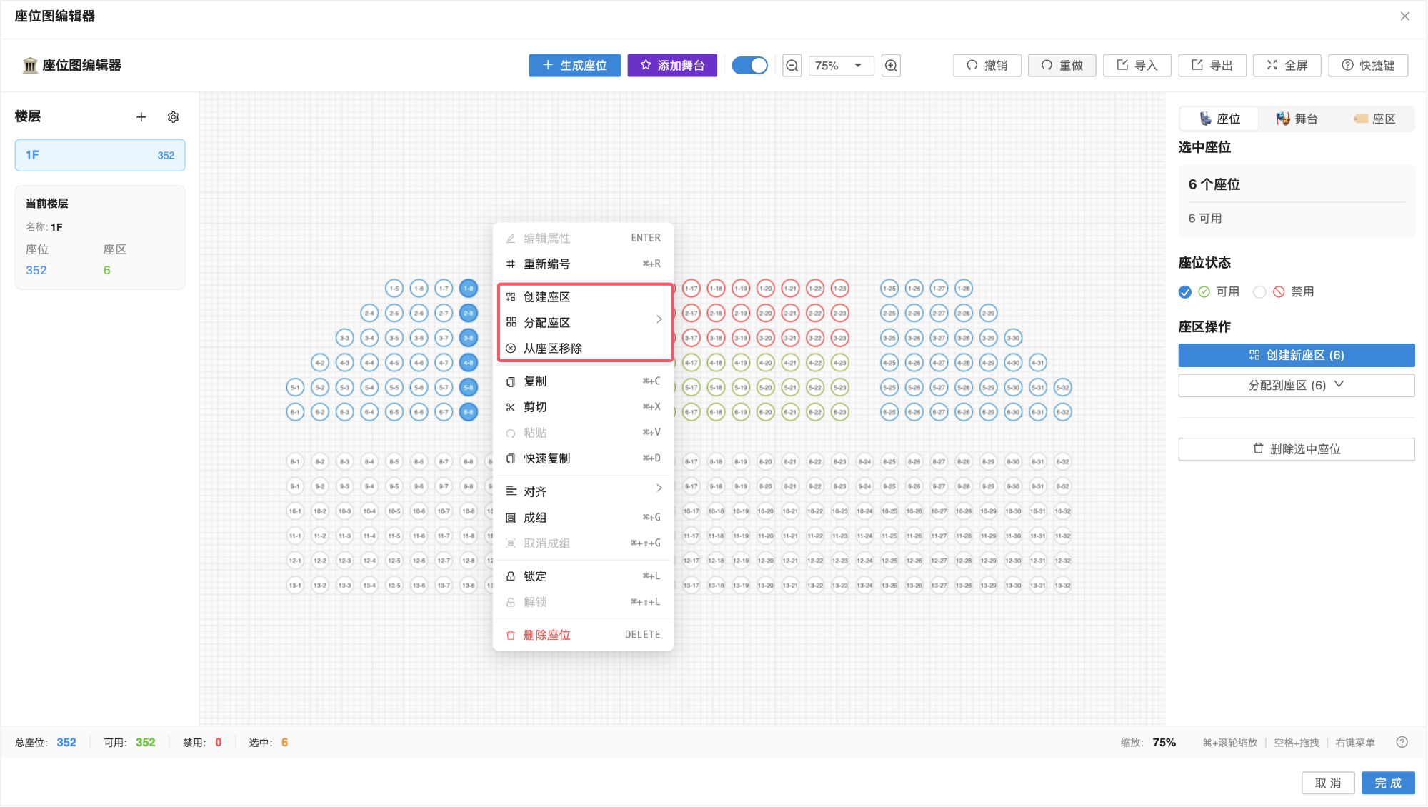 在画布中选中目标座位后,右键点击画布,在弹出的快捷菜单中可对座区进行操作: