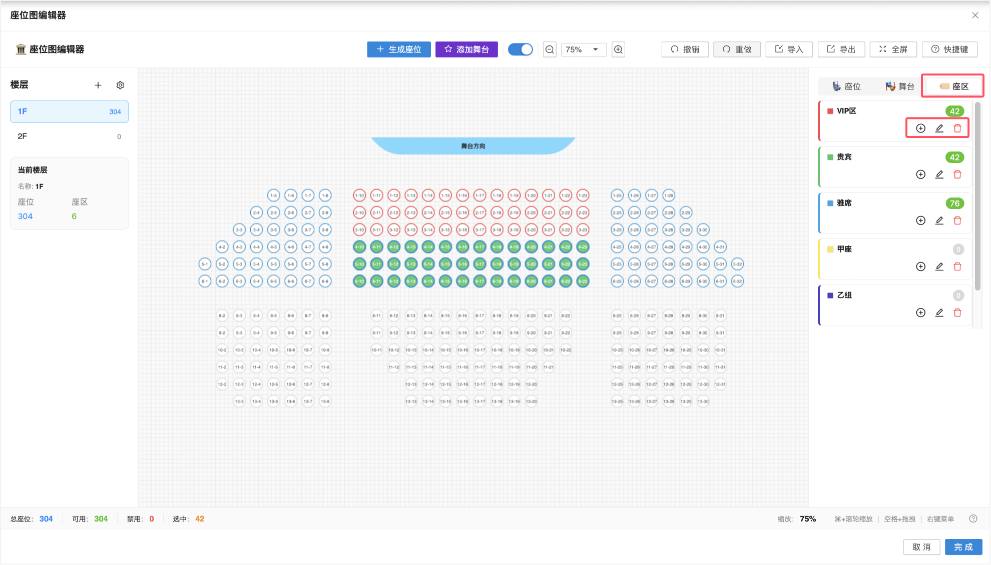 在画布中选中目标座位,切换到右侧「座区」面板,即可按需进行分配座区、编辑座区、删除座区操作。