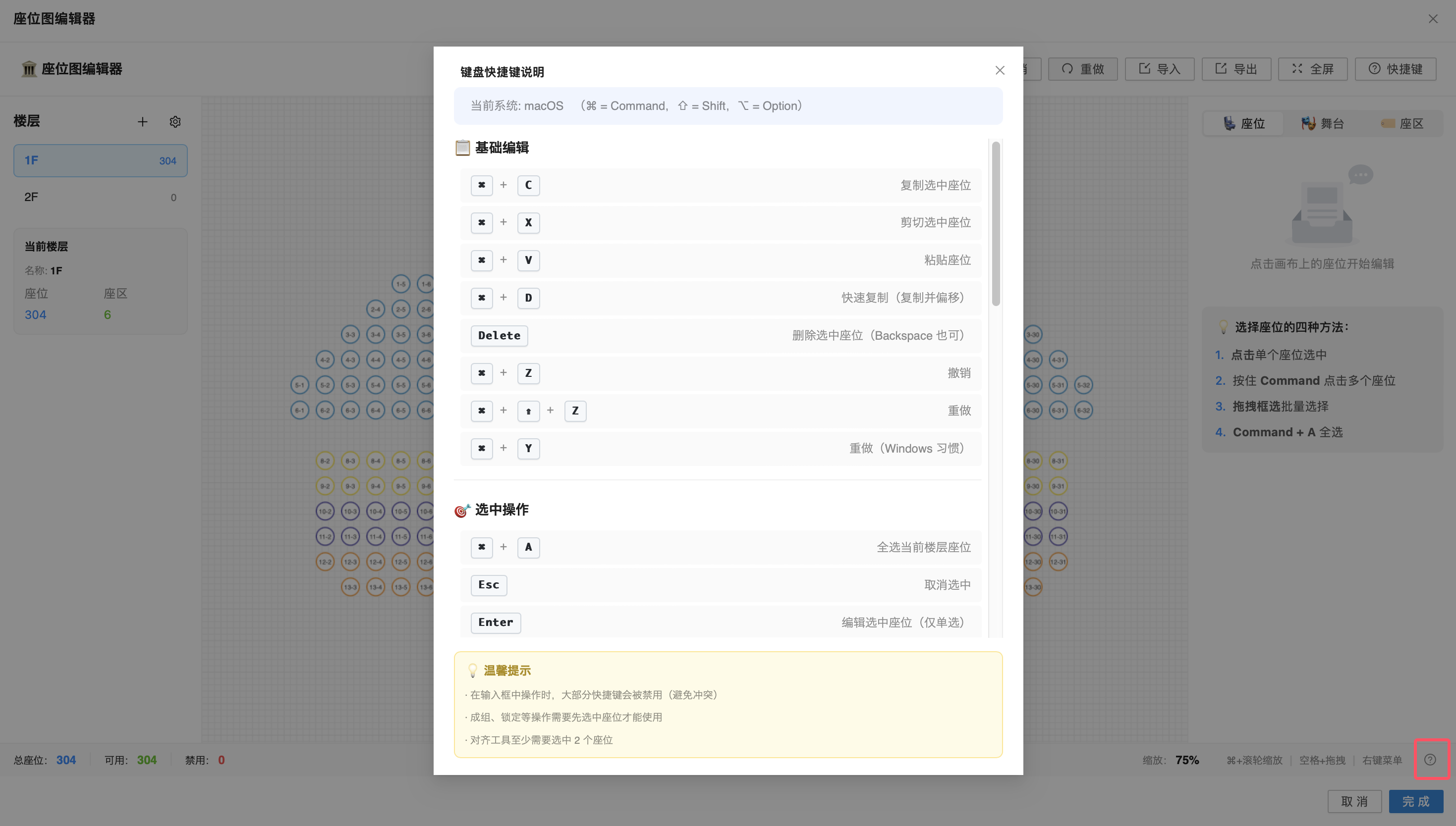如需查看键盘快捷键说明,可点击右下角【?】按钮,系统将展示当前操作系统(如 macOS)对应的常用快捷键,包括基础编辑(复制、剪切、粘贴、删除、撤销、重做)和选中操作(全选、取消选中、编辑选中座位)等功能,同时提供操作注意事项。