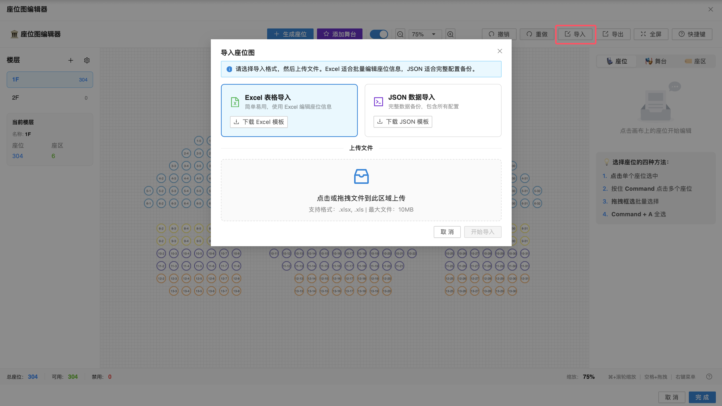 Excel 表格导入:适合批量编辑座位信息,可先下载 Excel 模板填写位置信息,再将文件拖入上传区域(支持 .xlsx/.xls 格式,最大 10MB),上传后画布坐标与 Excel 保持一致。
