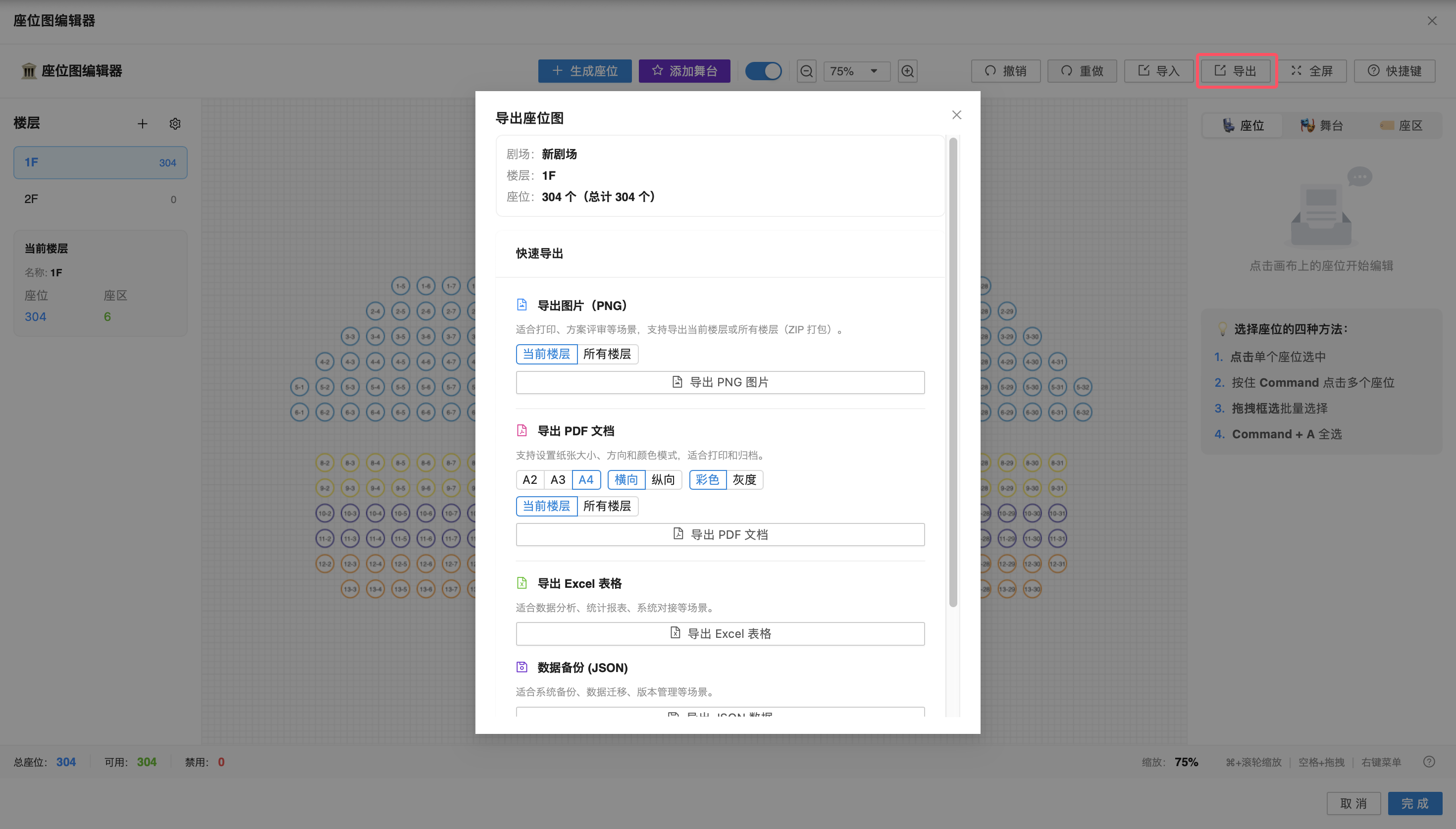 在需要打印座位图、进行数据分析或备份配置时,可使用导出功能: